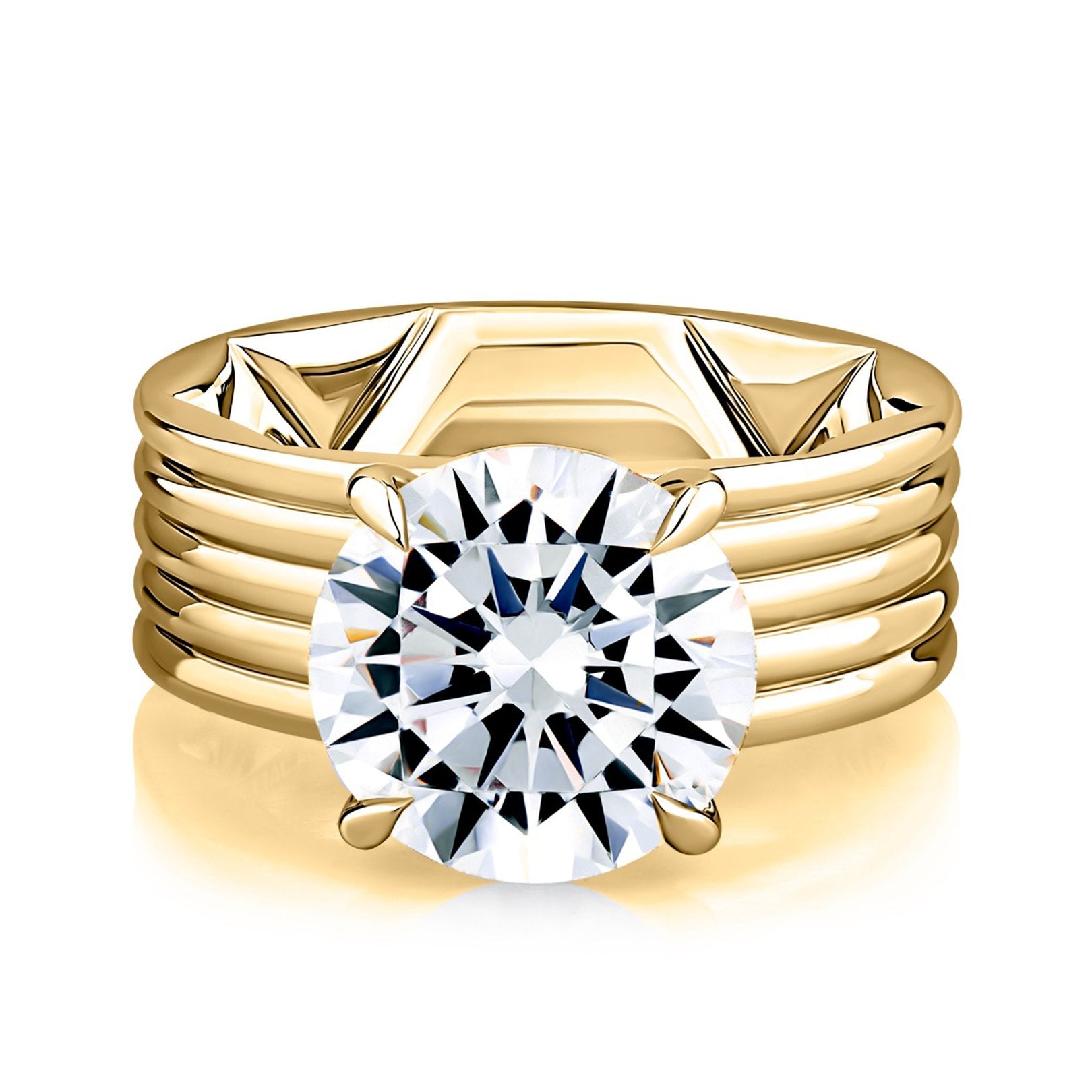 14K yellow gold Quilt solitaire ring with a hidden halo and four-prong setting for a 4.00 carat round center. Accented with 20 round diamonds totaling 0.10 carats, prong set, G color and SI clarity. Center sold separately. Available by special order in other metals, shapes, and sizes.