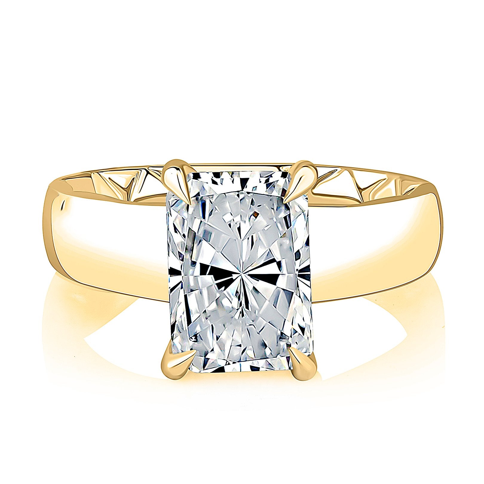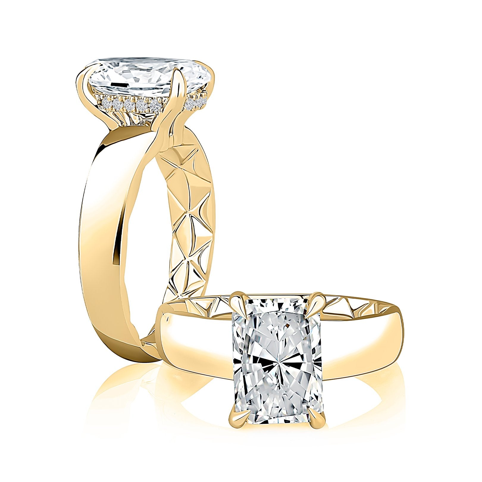 Crafted in 14K yellow gold, this hidden halo quilt solitaire ring is designed to hold a 3.00 carat radiant center stone in a 4-prong setting. It features 20 round diamonds totaling 0.10 carats, G color and SI clarity, secured in 4-prong settings within the hidden halo for added brilliance. Center sold separately. Available by special order in other metals, shapes, and sizes.