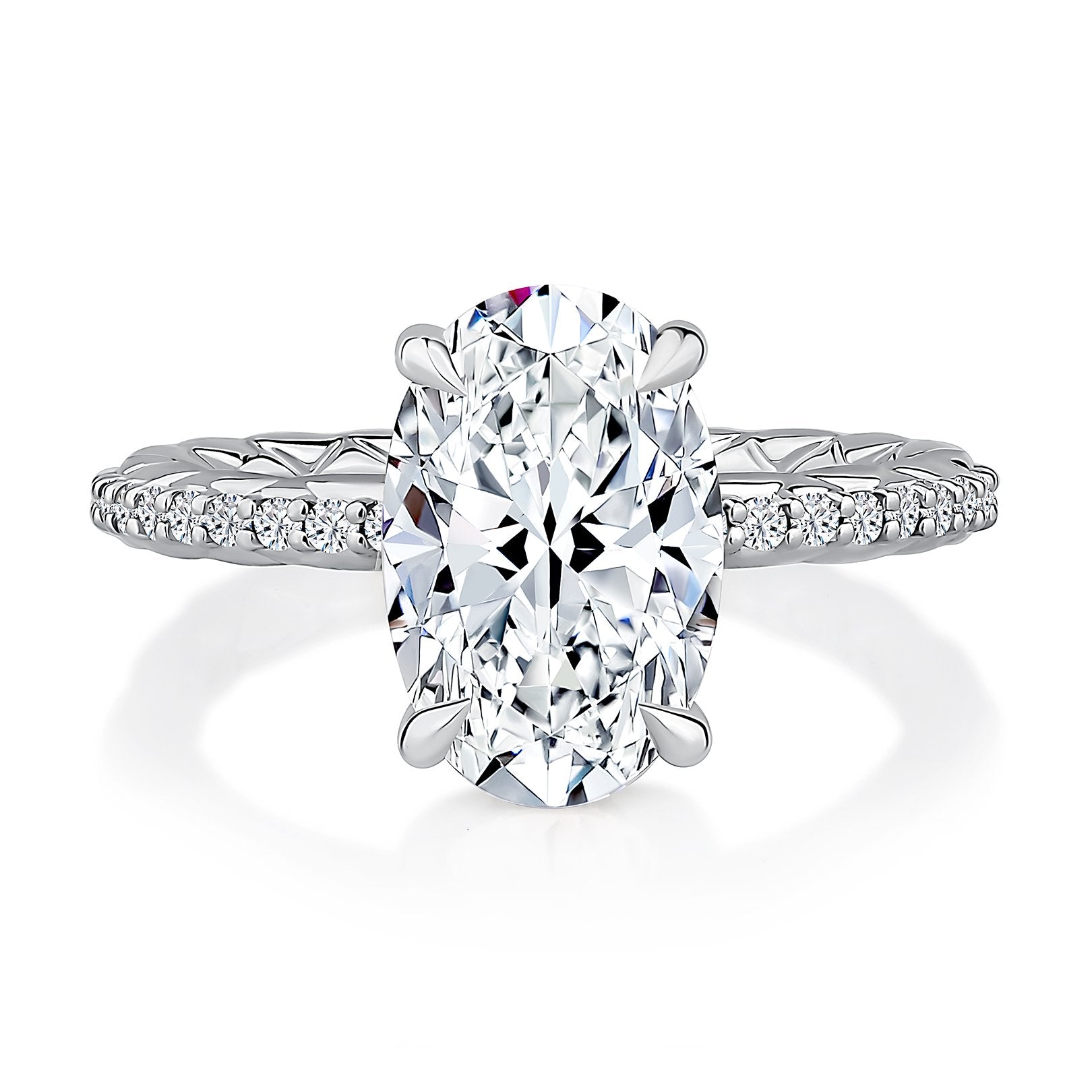 18KT white gold semi-mount ring designed for a 2.00CT oval center, featuring a quilt-style hidden halo with 34 shared prong-set round diamonds totaling 0.22CTW (G/VS). Center sold separately. Available by special order in other metals, shapes, and sizes.