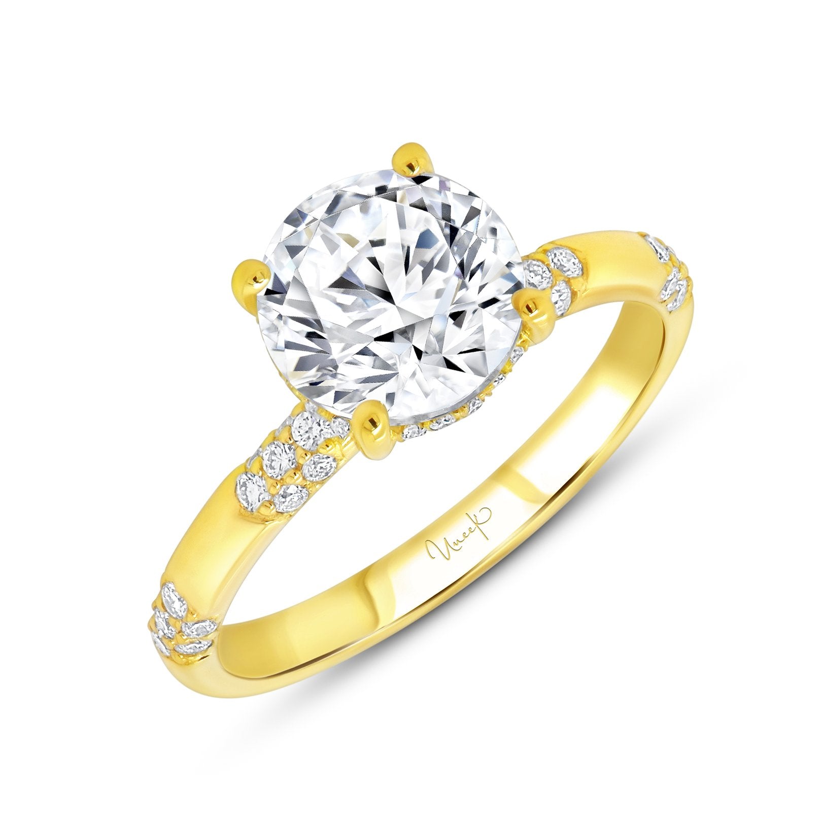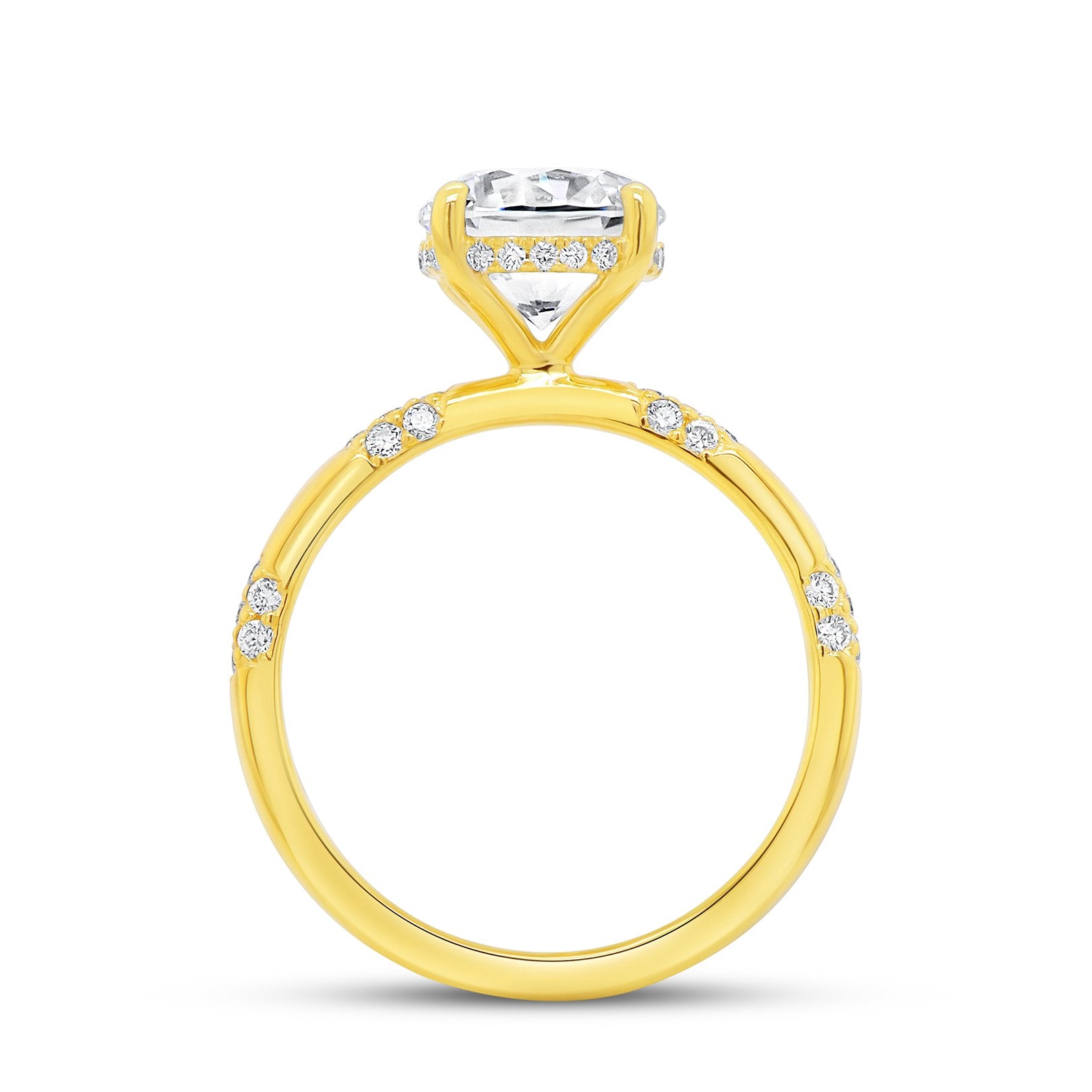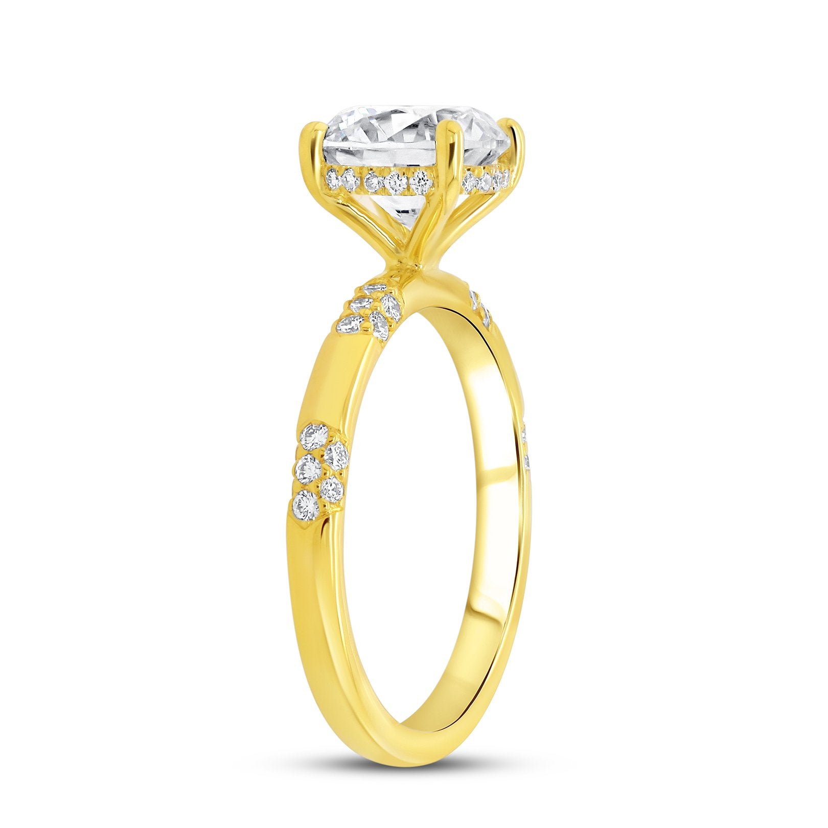 18K yellow gold hidden halo semi-mount ring with a four-prong setting for a 2.00 carat round center. Accented with 48 round diamonds totaling 0.28 carats, prong set, FG color and VS clarity. Center sold separately. Available by special order in other metals, shapes, and sizes.