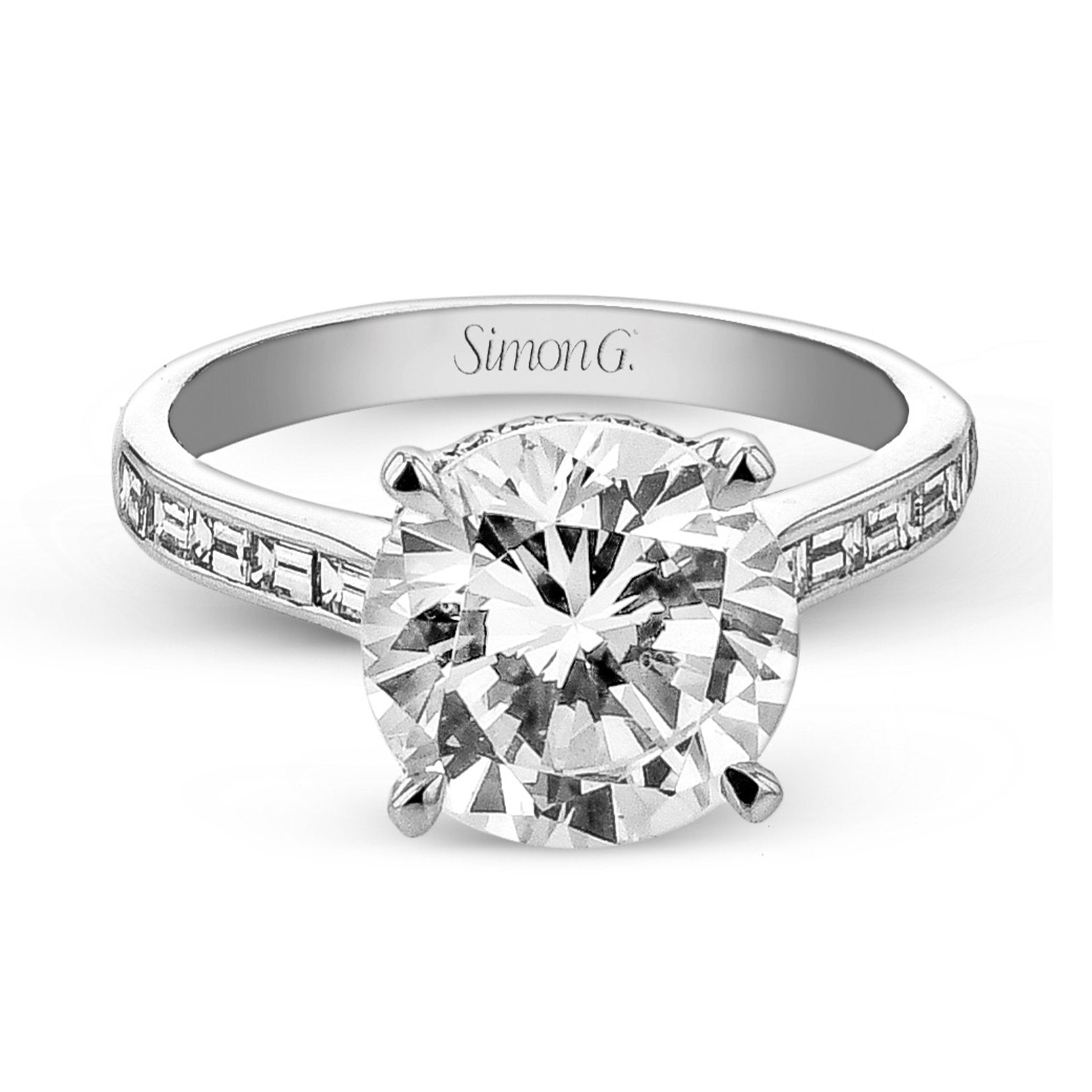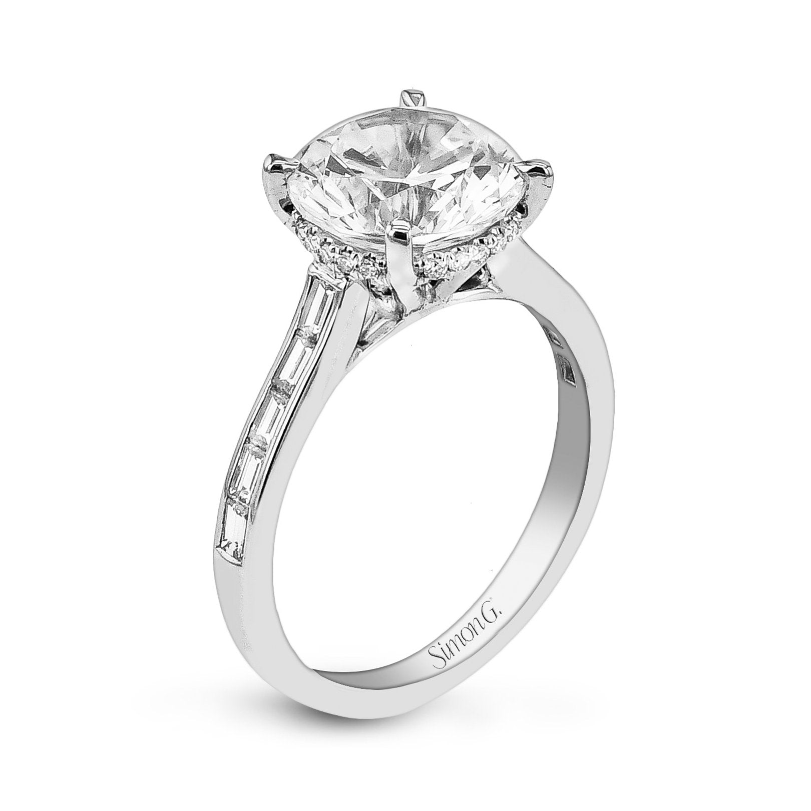 18kt white gold hidden halo semi-mount ring for a 3.00ct round center stone in a 4-prong setting, featuring 20 prong-set round diamonds (0.07ctw) in the halo and 10 channel-set straight baguette diamonds (0.46ctw, GH/VS2) along the band.