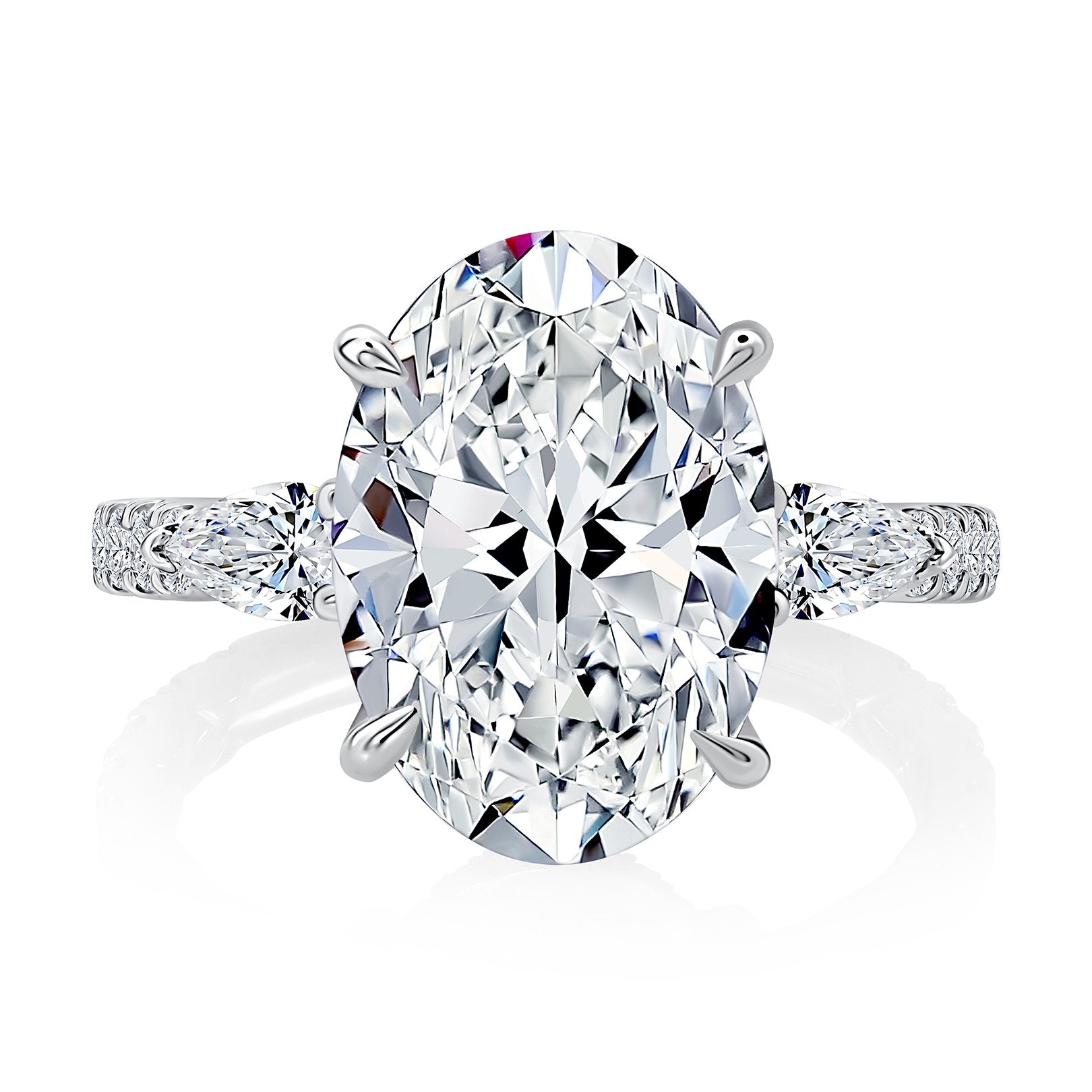 14K white gold 3/4 Quilt semi-mount ring with a hidden halo and four-prong setting for a 5.00 carat oval center. Accented with 34 pear and round diamonds totaling 0.98 carats, prong set, G color and SI clarity. Center sold separately. Available by special order in other metals, shapes, and sizes.