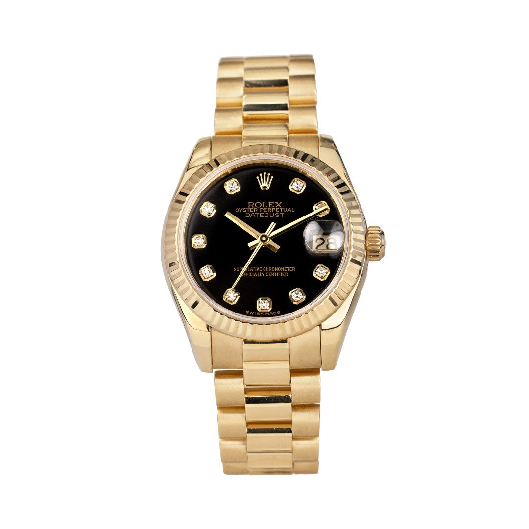This pre-owned Rolex Datejust 31 (Ref. 178278) showcases a striking black dial with diamond hour markers, framed by an 18k yellow gold fluted bezel and housed in a 31mm yellow gold case. Powered by the Calibre 2235 automatic movement, it offers reliable performance with a quickset date function. The watch is fitted with an 18k yellow gold President bracelet, known for its semi-circular links and elegant, feminine profile. This example is in excellent pre-owned condition and includes its original box only.