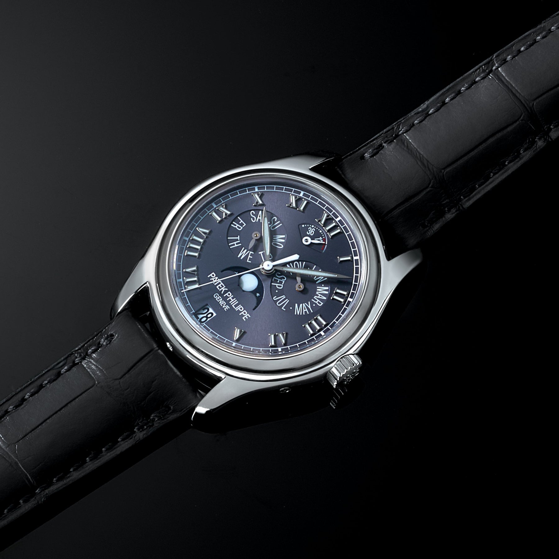 This pre-owned Patek Philippe Annual Calendar Ref. 5056P brings together classic Patek elegance and the technical sophistication of the brand’s signature annual calendar complication. Crafted in platinum, the watch features a deep charcoal/black dial with applied Roman numerals, beautifully balanced by day, date, and month sub-indications. A moon phase display adds a poetic touch at 6 o’clock, while the power-reserve indicator at 12 o’clock keeps the complication set running smoothly. Paired with a black alligator strap, this reference embodies understated luxury and the timeless charm that defines Patek Philippe’s most collectible calendar pieces. Just fully serviced by Patek Philippe, this timepiece dates to 2006 and includes its original boxes, portfolio, manual, Certificate of Origin, service box, and service tag.