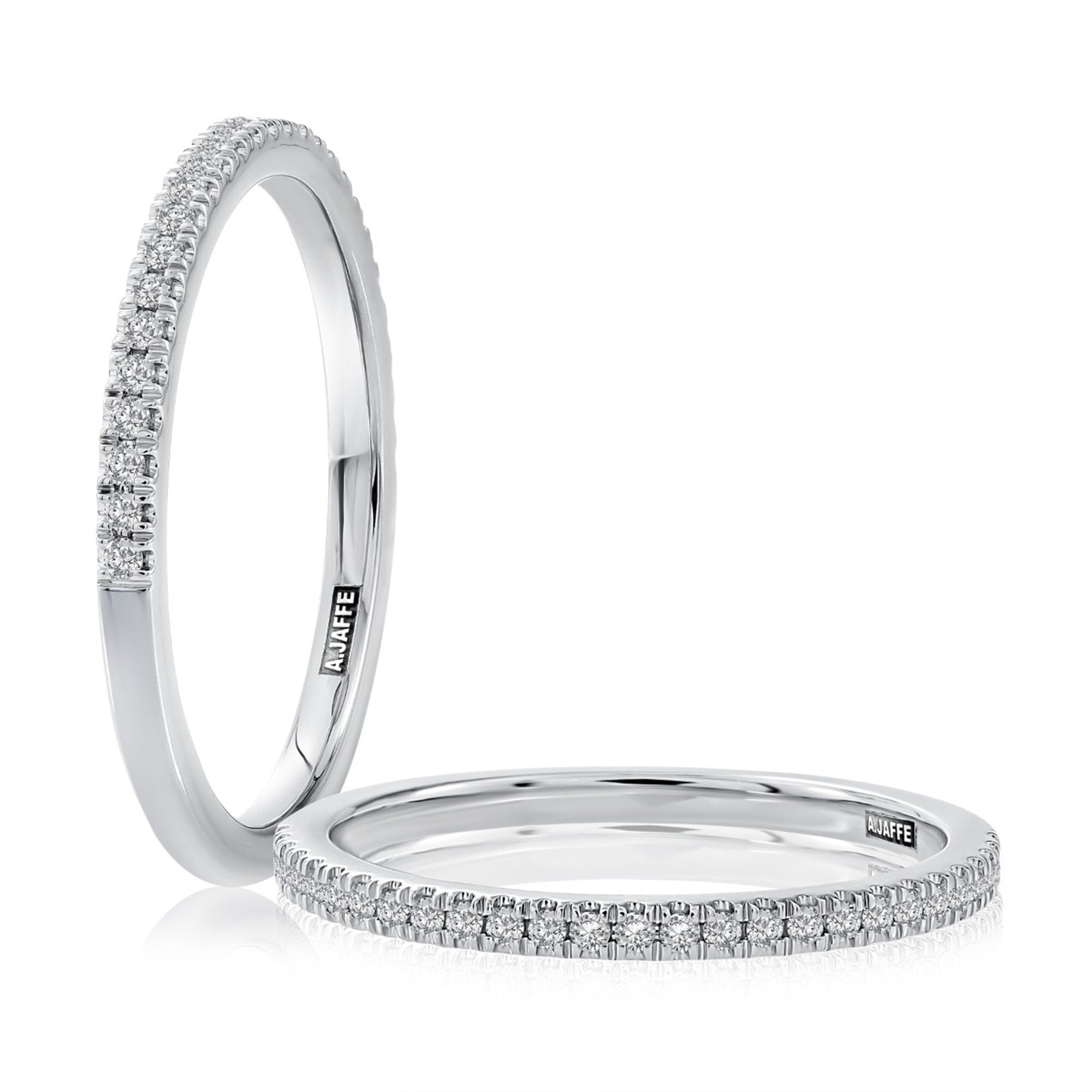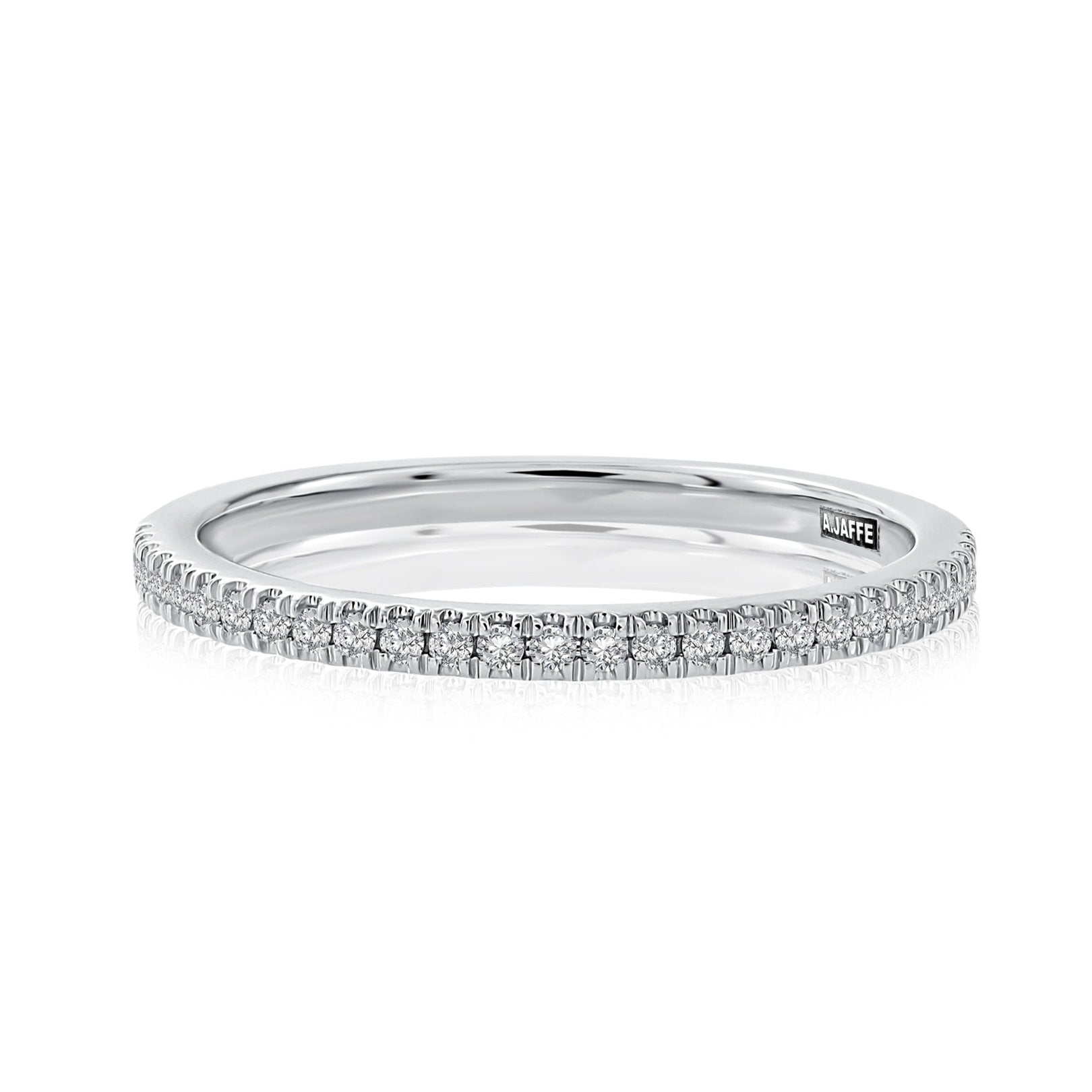14KT white gold anniversary band by A. Jaffe, featuring 27 round G/SI diamonds totaling 0.15ctw, set in classic 4-prong settings.