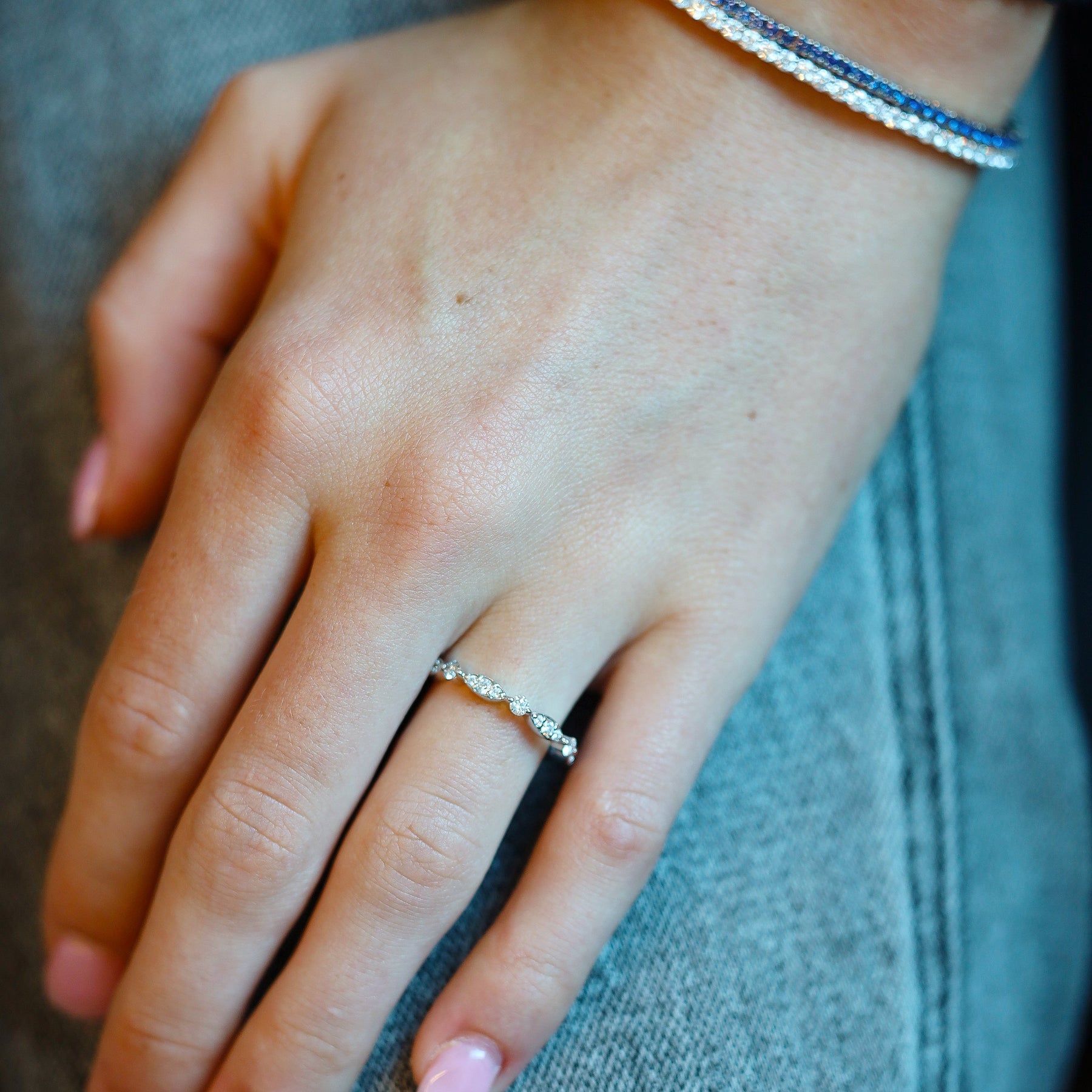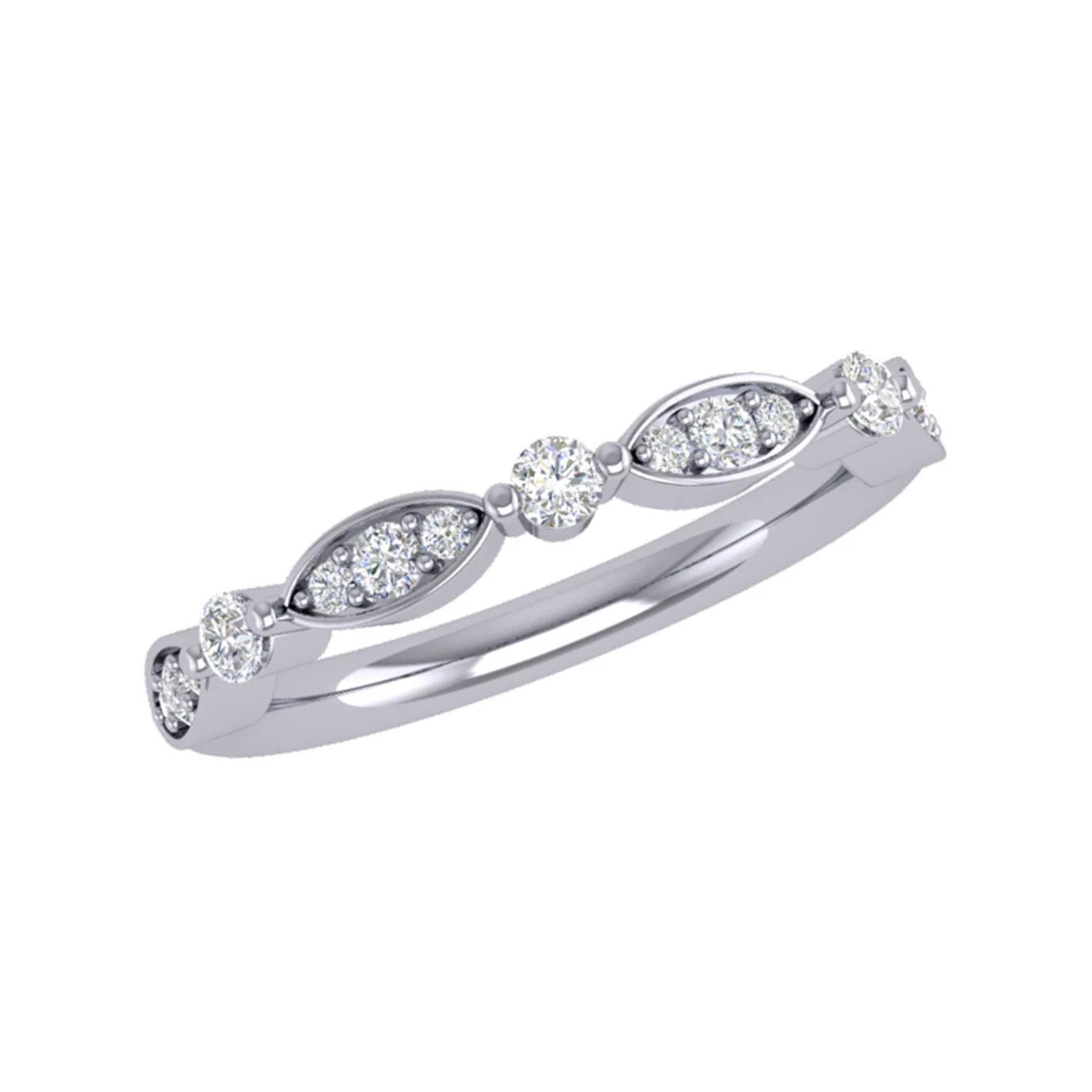 18K white gold anniversary band with 15 round diamonds totaling 0.22 carats (GH/VS), set in alternating groups of three and single prong settings. From the Signature Collection by Continental Diamond.