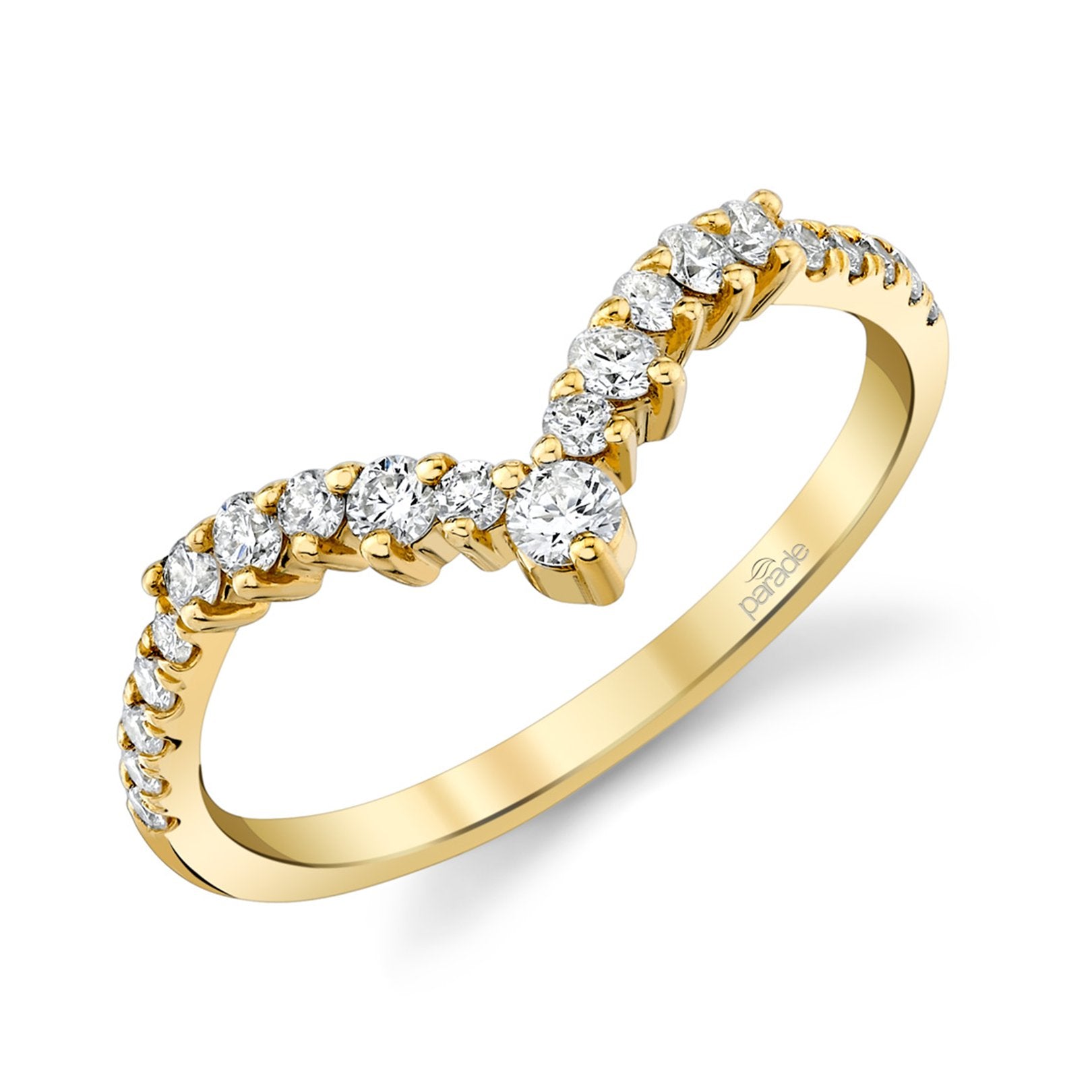 14K yellow gold V-shaped band featuring 21 shared prong-set graduating round diamonds (0.31ctw, GH color, VS–SI1 clarity).