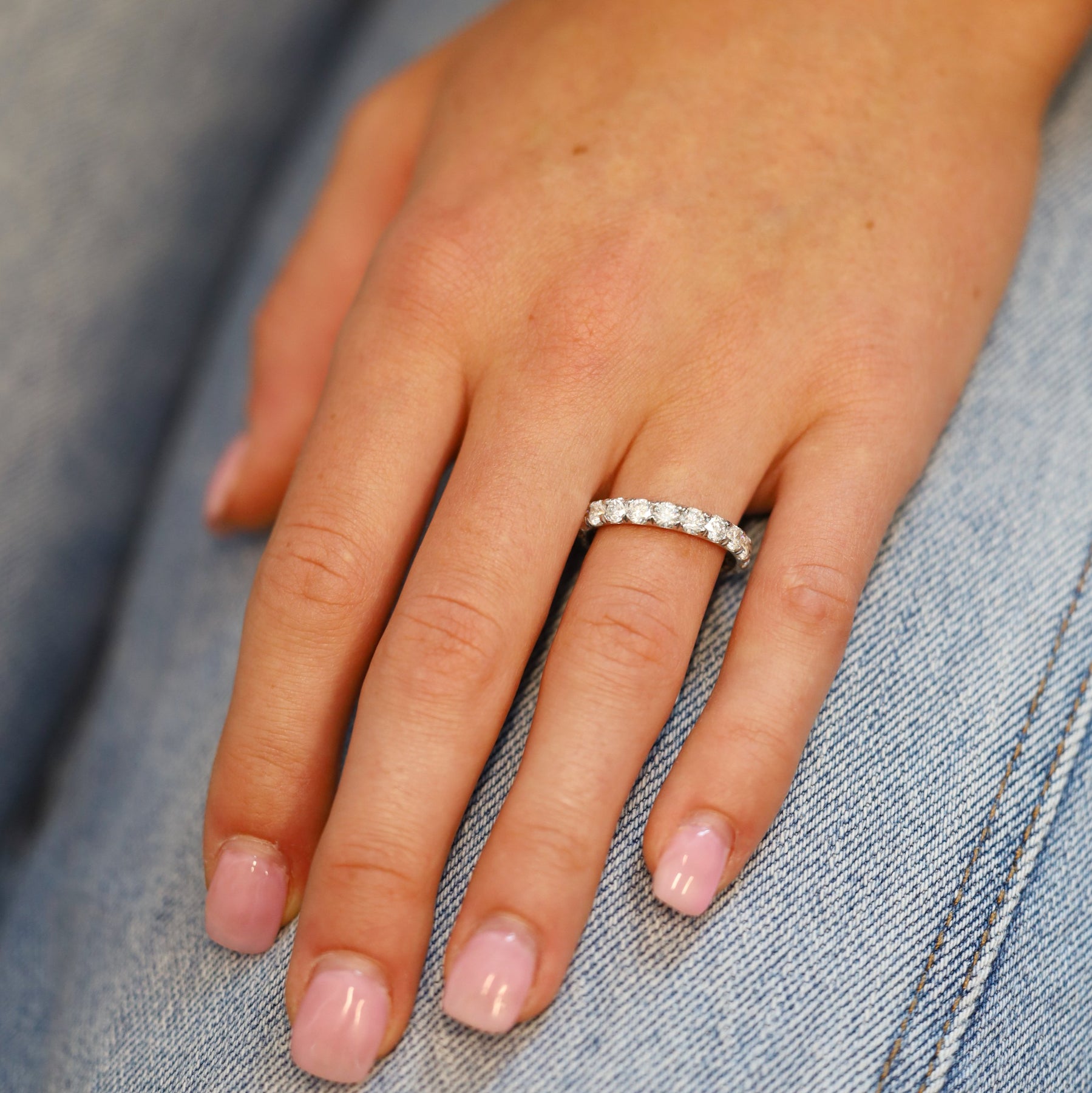 This 14K white gold eternity band features 19 round diamonds totaling 2.50 carats, set in a shared split prong design. Diamonds are GH color and VS clarity. Part of the Signature Collection by Continental Diamond.