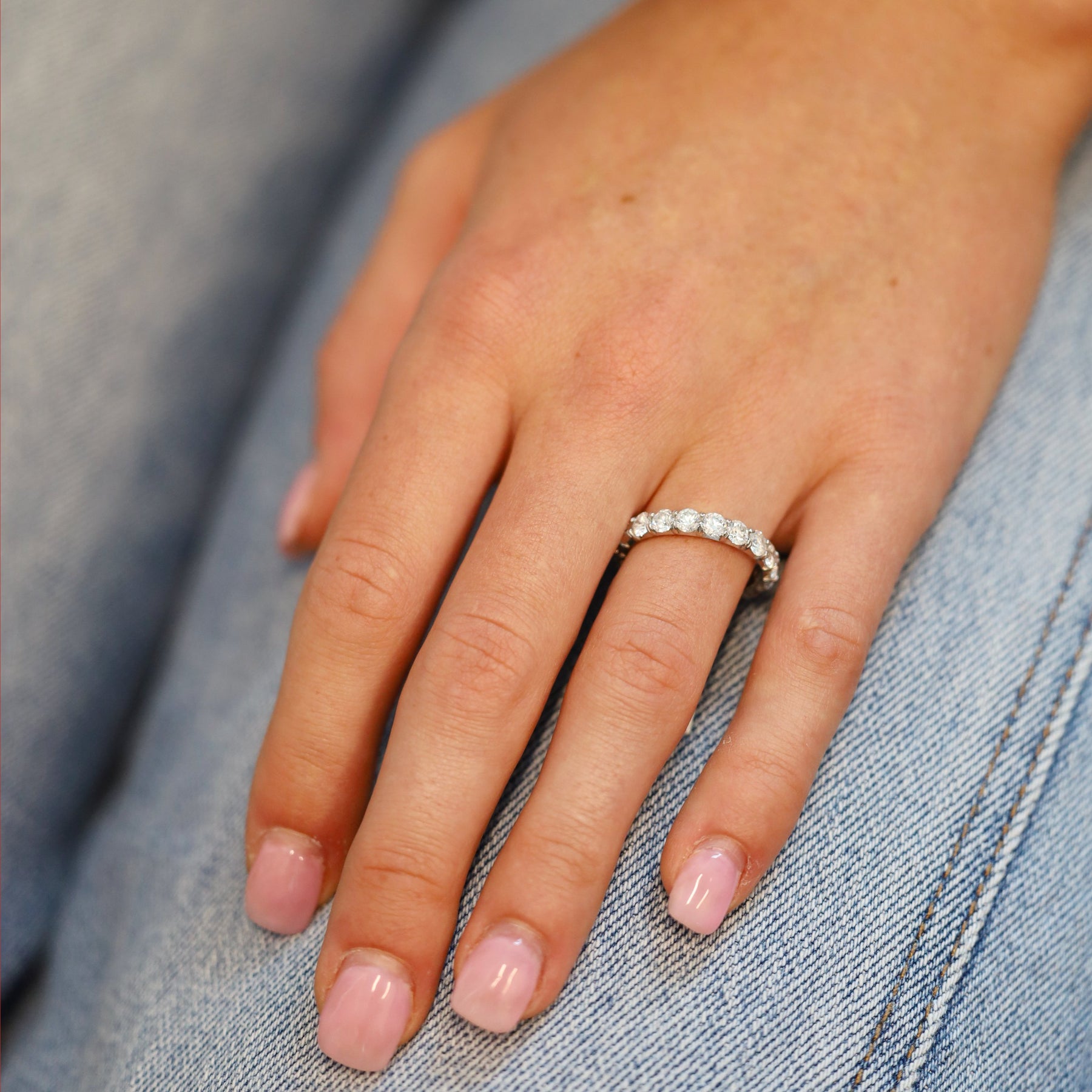 This exquisite eternity band is crafted from 18KT palladium white gold and features 19 round diamonds totaling 2.95 carats. The diamonds are shared split prong set, showcasing GH color and VS clarity for exceptional brilliance. A timeless piece from Continental Diamond’s Signature Collection.