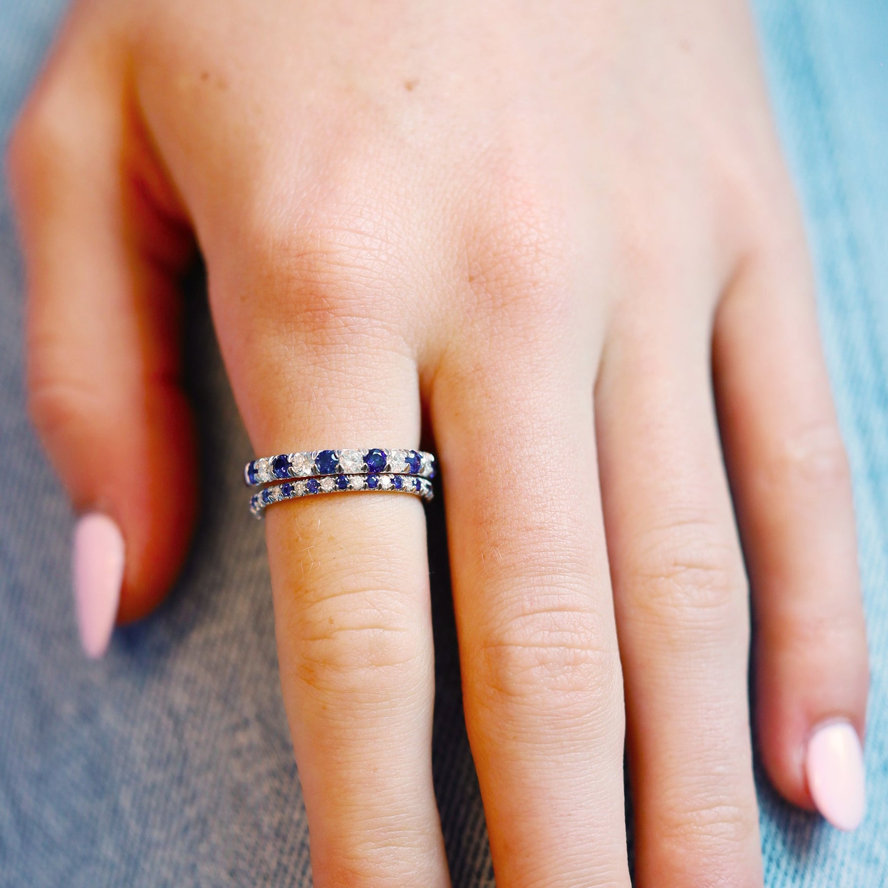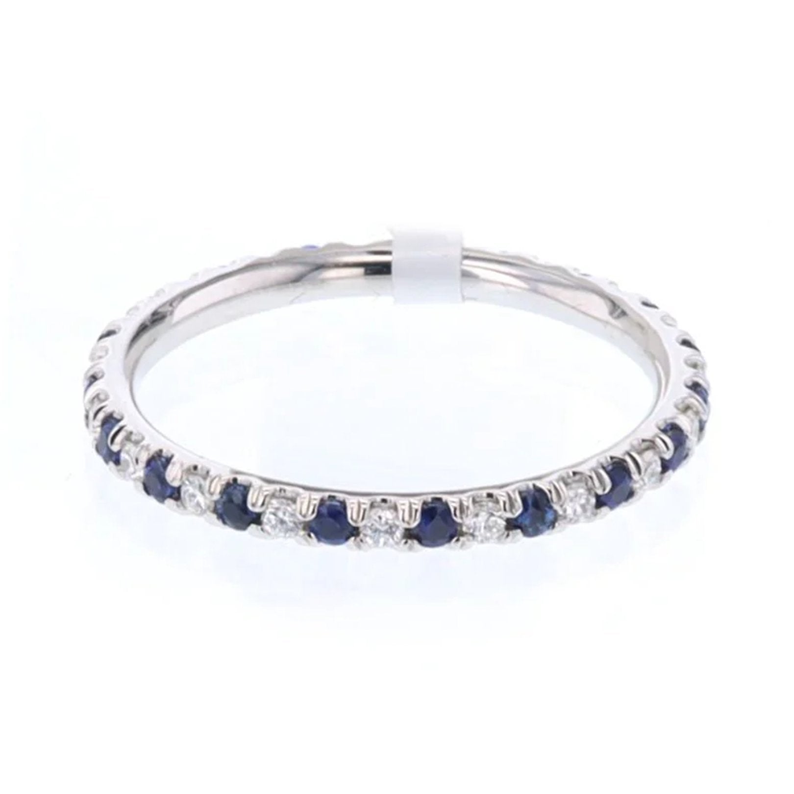 18K white gold eternity band from The Signature Collection by Continental Diamond featuring 38 prong-set stones totaling 0.56 ctw, including 0.24 ctw of round diamonds (GH/VS) and 0.32 ctw of round blue sapphires.