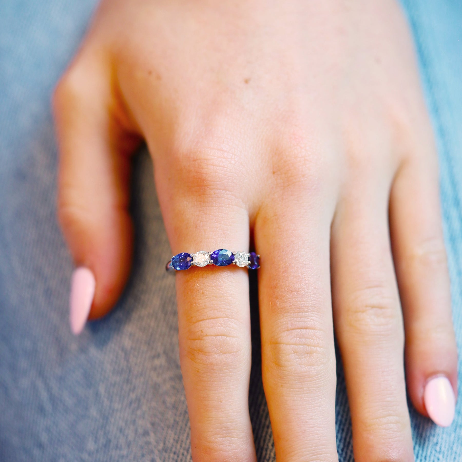 18KT white gold band from The Signature Collection by Continental Diamond, featuring 3 oval blue sapphires (1.60 CTW) and 2 round diamonds (0.50 CTW), all shared prong set, graded GH/VS.