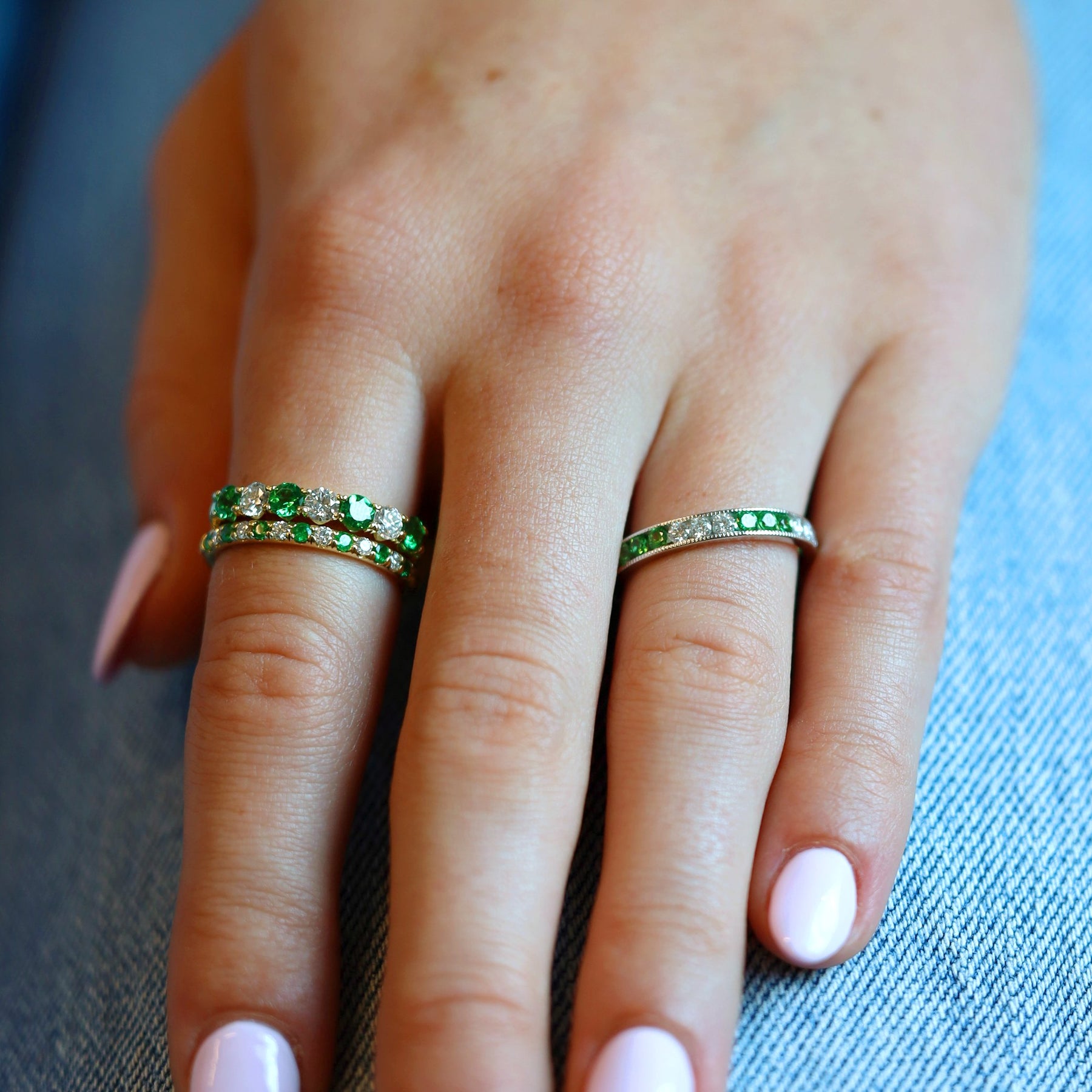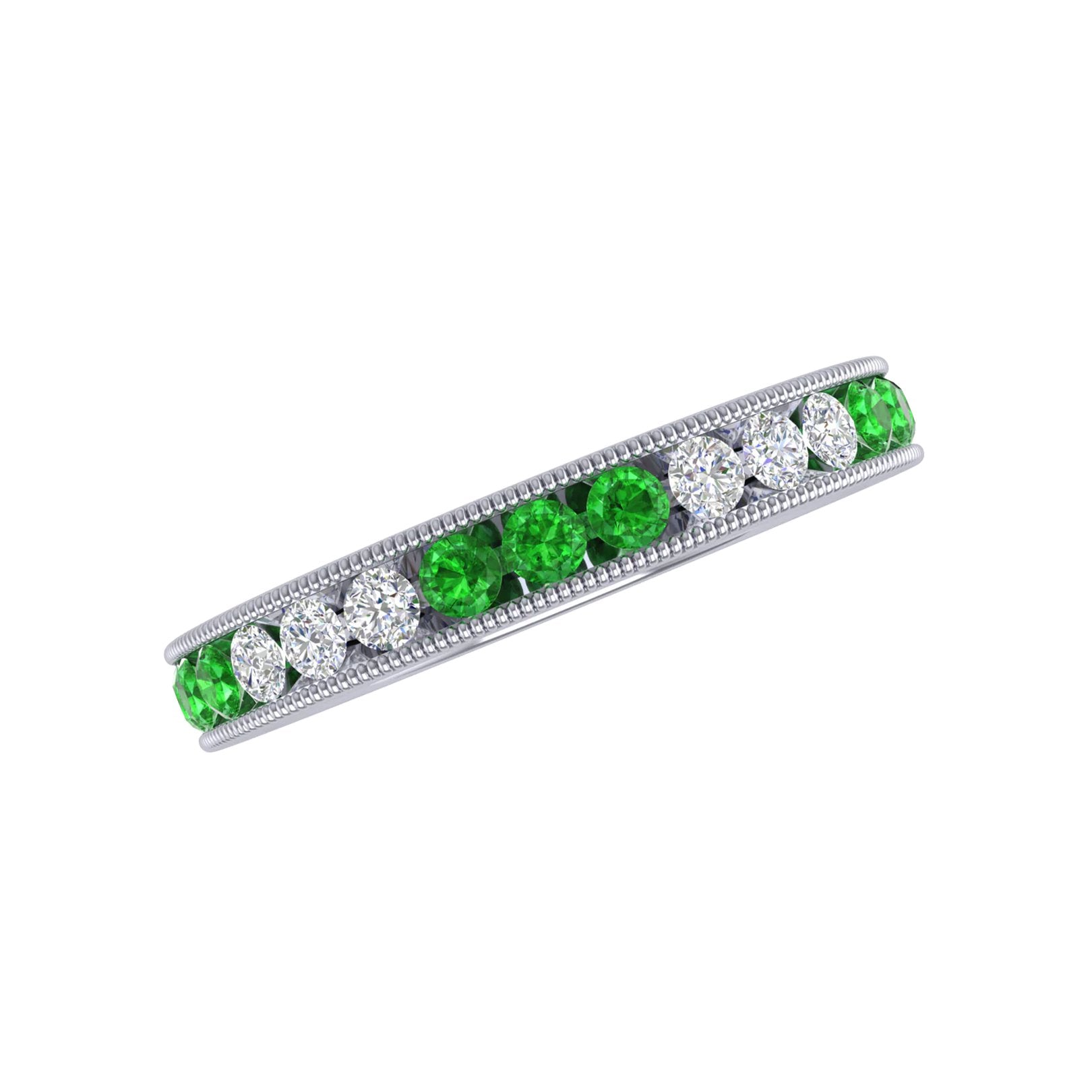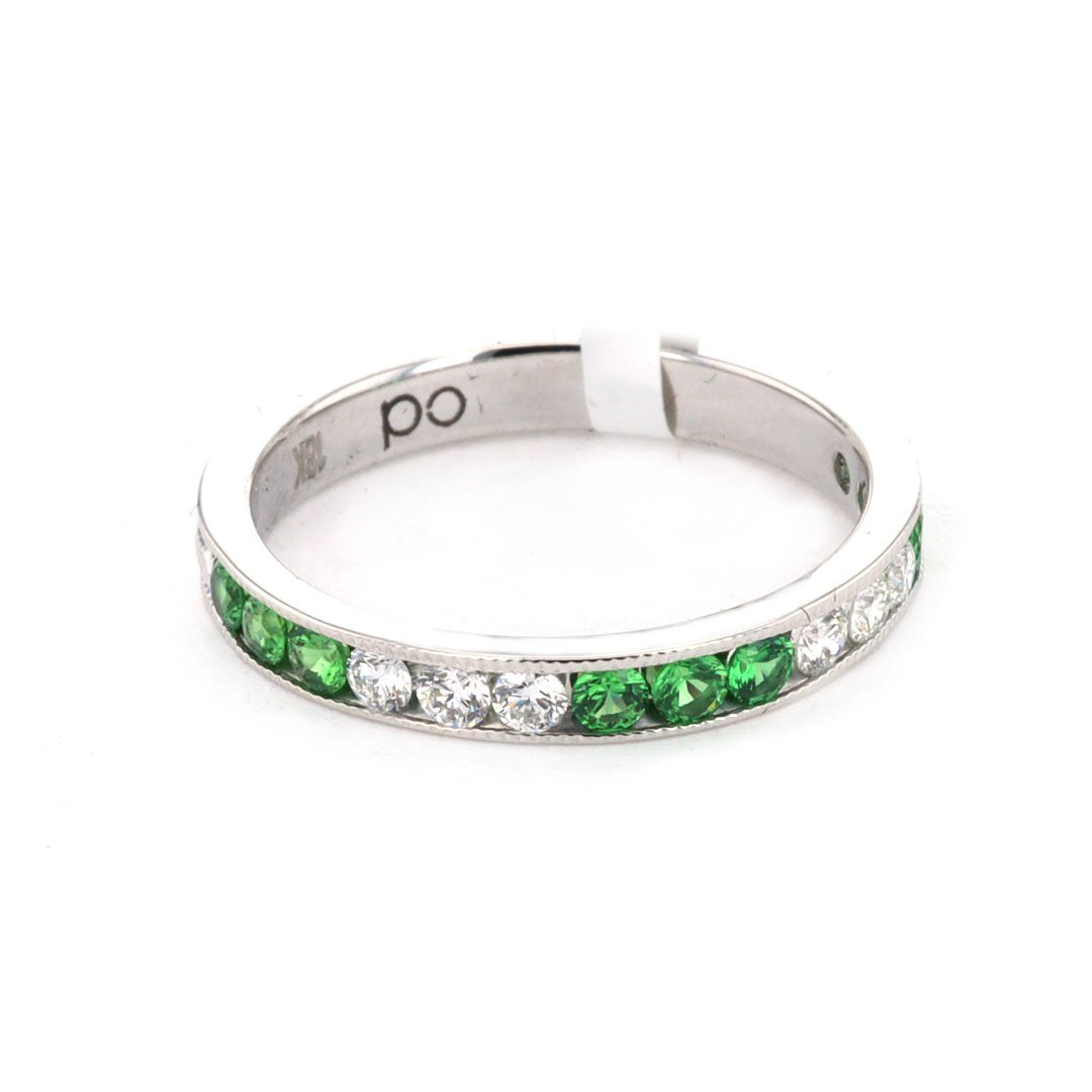 18K white gold milgrain channel-set band with 9 round tsavorite garnets totaling 0.41 carats and 6 round diamonds totaling 0.19 carats (GH/VS). From the Signature Collection by Continental Diamond.