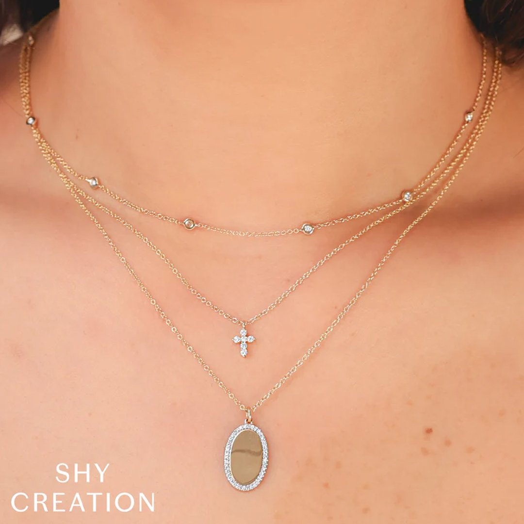 14KT yellow gold 15"+3" high polish necklace with an oval halo pendant set with 42 round diamonds totaling 0.11CTW. Diamonds are GH color, SI clarity.