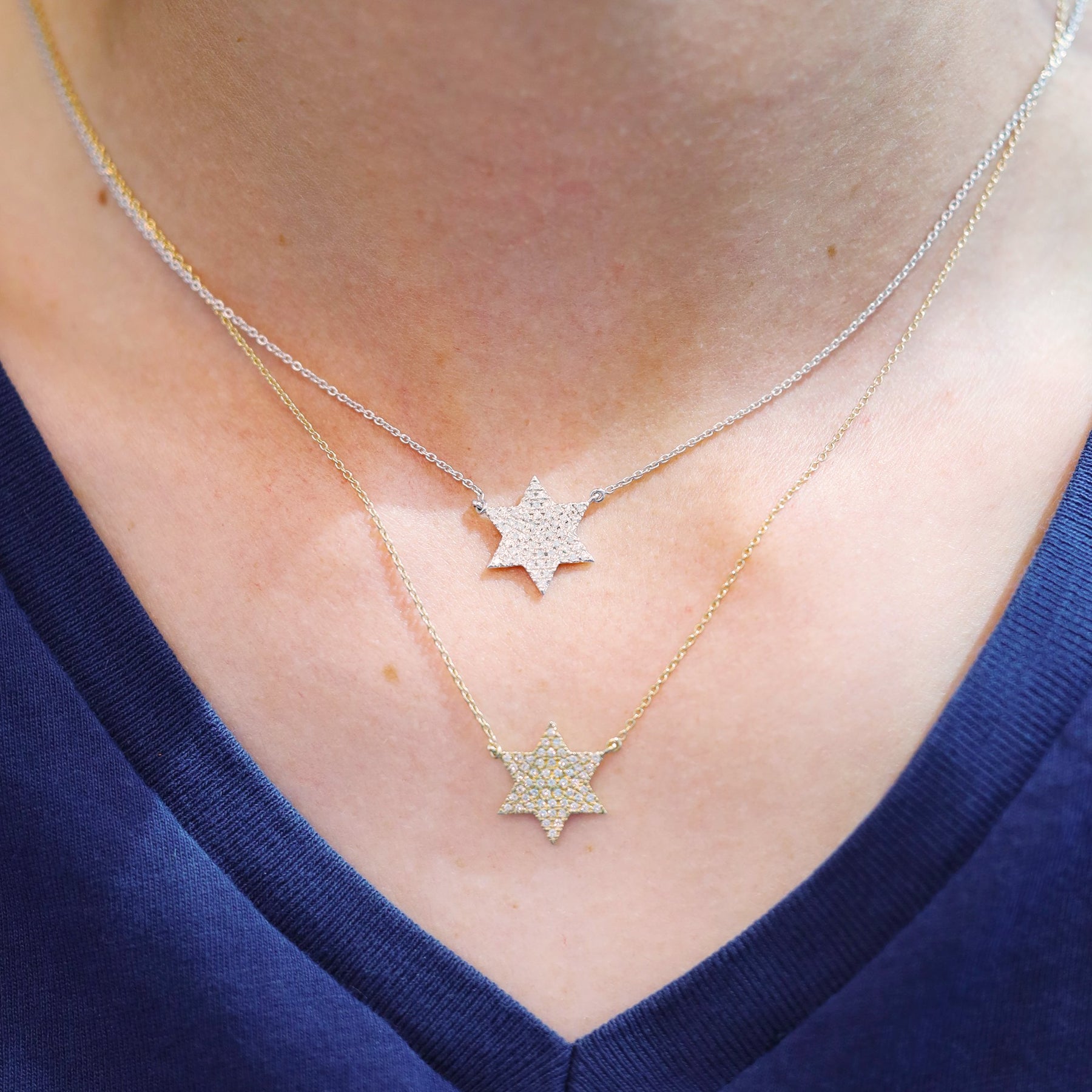 14KT white gold Star of David necklace measuring 16 inches with a 2-inch extender, featuring 55 pave-set round GH/SI2 diamonds totaling 0.19ctw.
