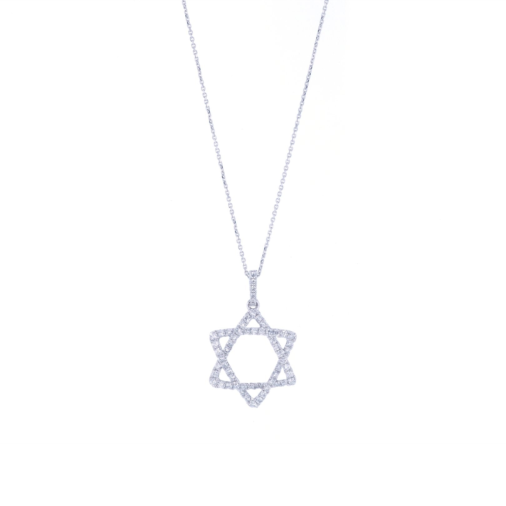 14K white gold Star of David pendant with 0.38ctw prong-set round diamonds (HI color, SI clarity), on an 18" 14K white gold diamond-cut cable chain.