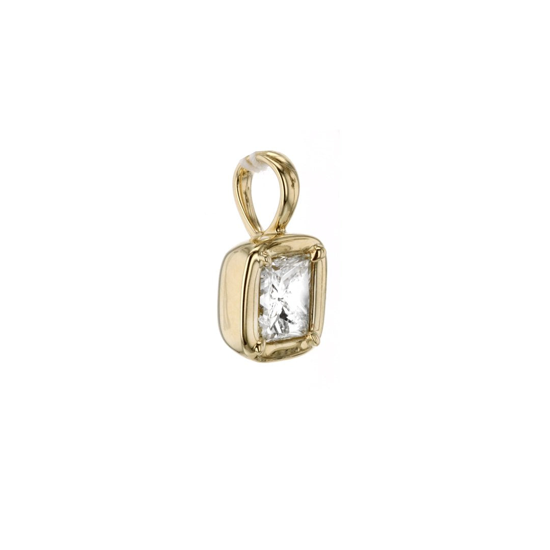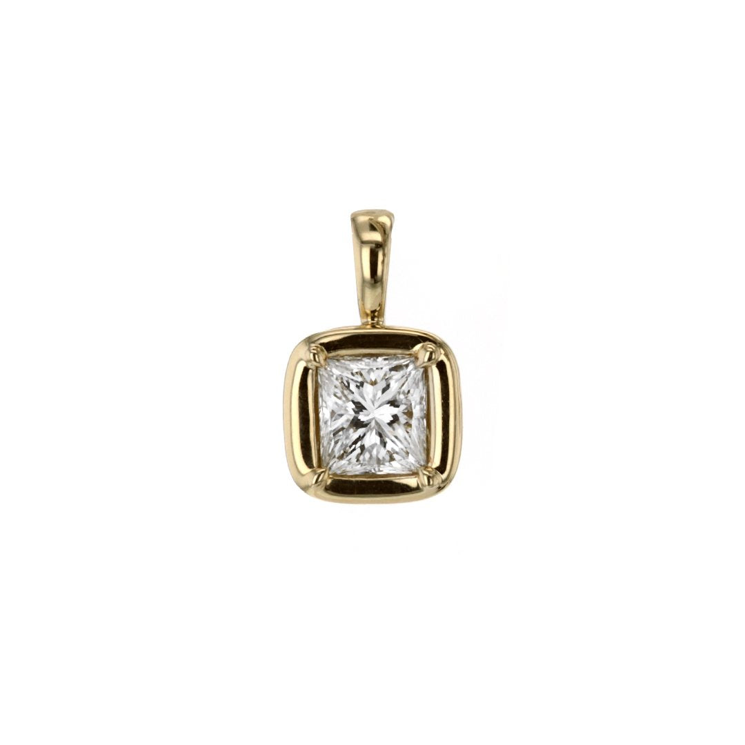 This 14K yellow gold solitaire pendant features a 2.02ct bezel-set princess-cut diamond (I/VS1), GIA #2221307687. Custom created by Continental Diamond. Chain sold separately.