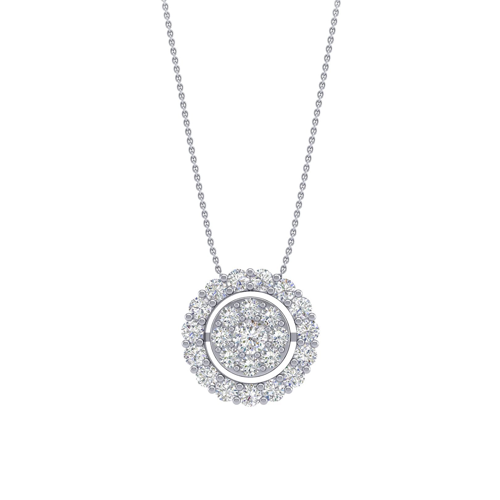This 22-inch round halo cluster necklace in 18K white gold features 24 round diamonds totaling 2.62 carats. Diamonds are GH color and VS clarity, set in a shared prong design. Part of the Signature Collection by Continental Diamond.