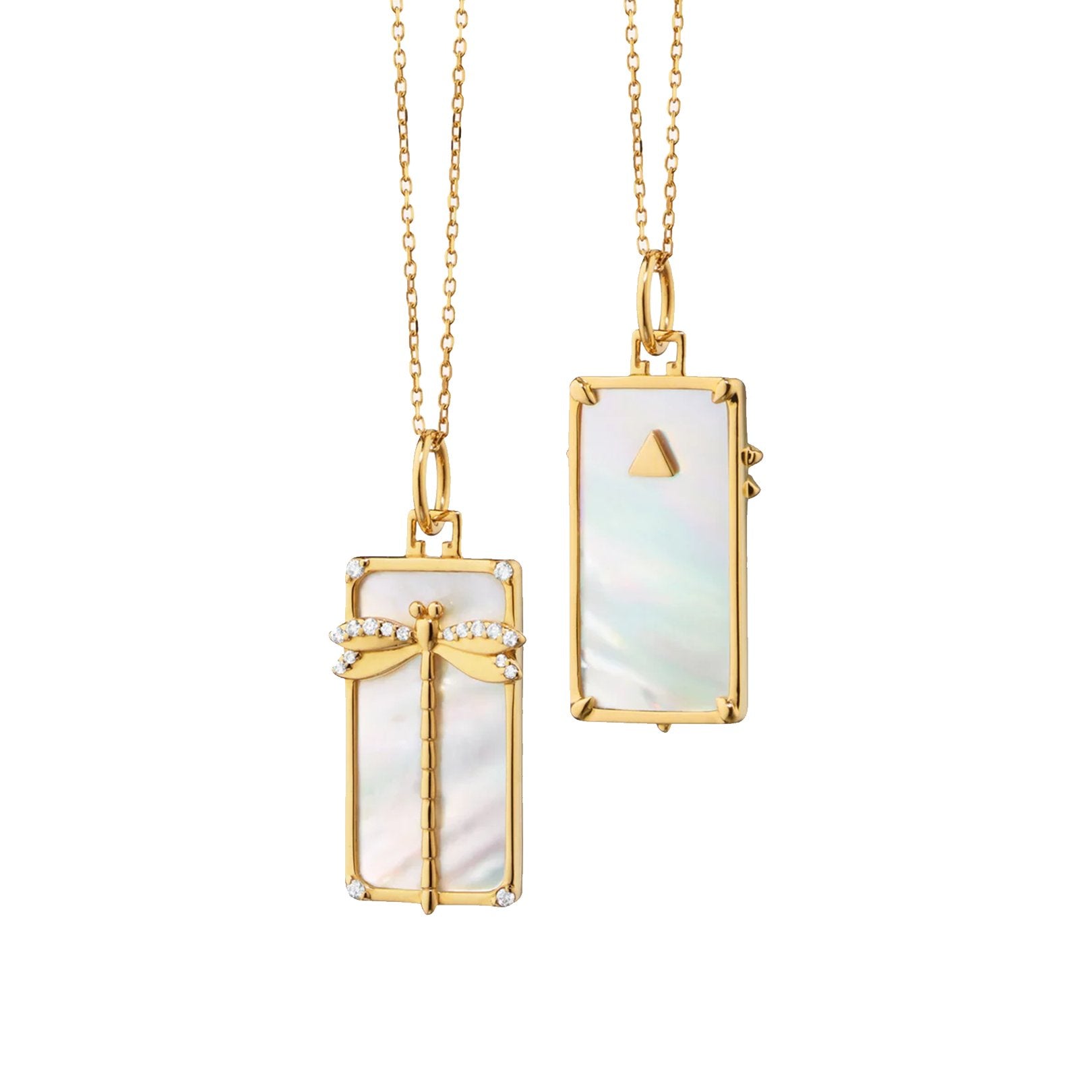 This 18K yellow gold dragonfly charm features 3.57ctw mother-of-pearl accented with 0.09ctw shared prong–set round diamonds (FG/VS1–VS2), on a 16"+1" chain.