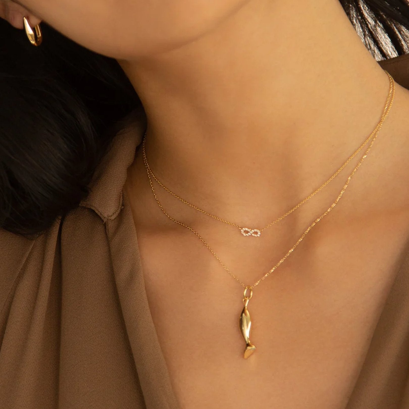 This 18K yellow gold small fish charm pendant is set on a 16"+1" mini diamond-cut chain.