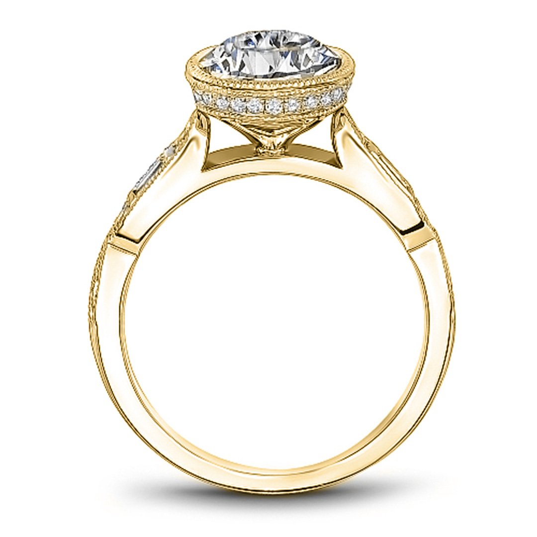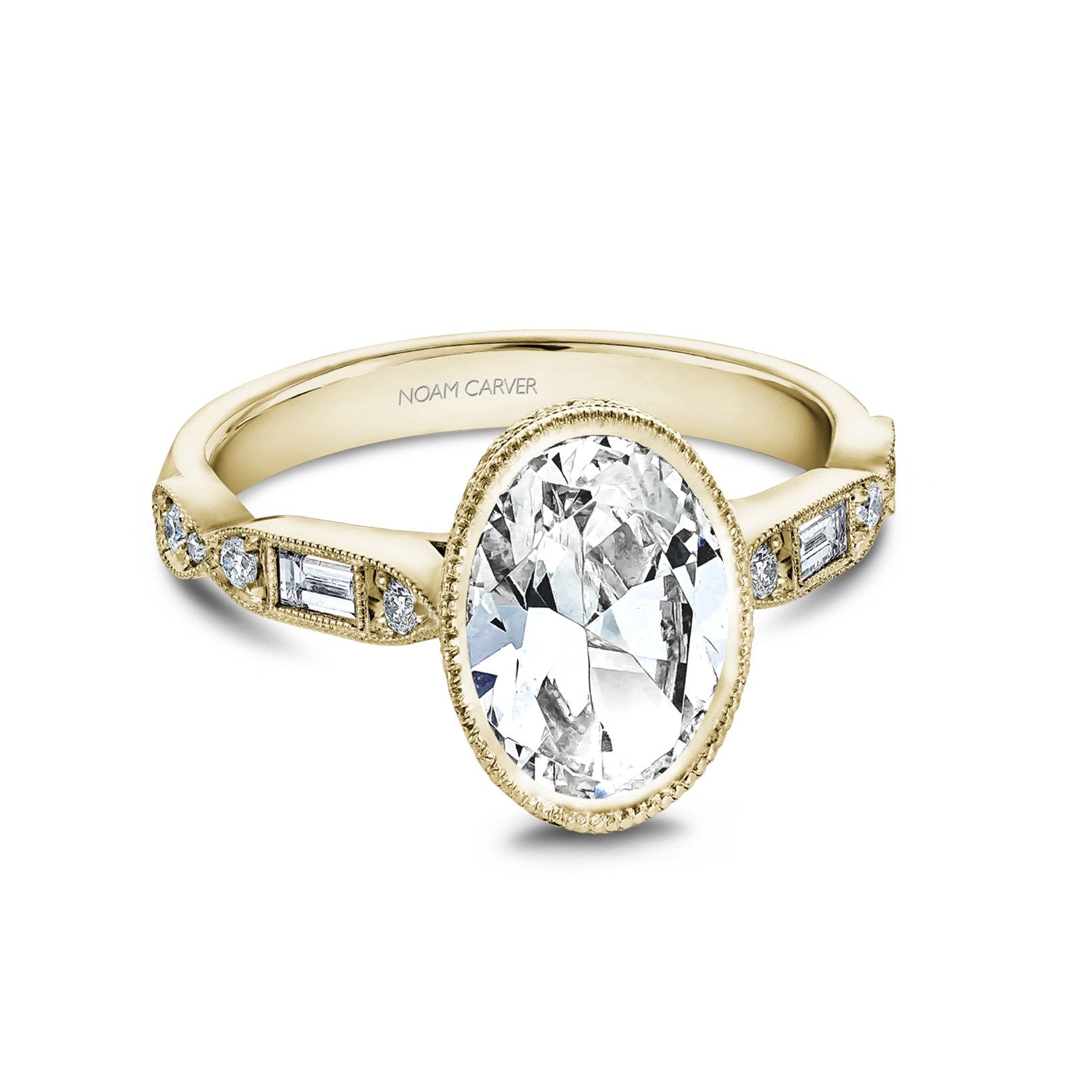 This semi-mount ring from the Noam Carver Collection is crafted in 14K yellow gold with a diamond gallery and milgrain detail. It features an oval bezel setting designed to hold a 1.50 carat oval crown size. The ring is accented with 34 round and straight baguette diamonds totaling 0.30 carats in prong settings, graded GH color and SI clarity. Available by special order in other metal colors, metal types, diamond shapes, and sizes. Center sold separately.