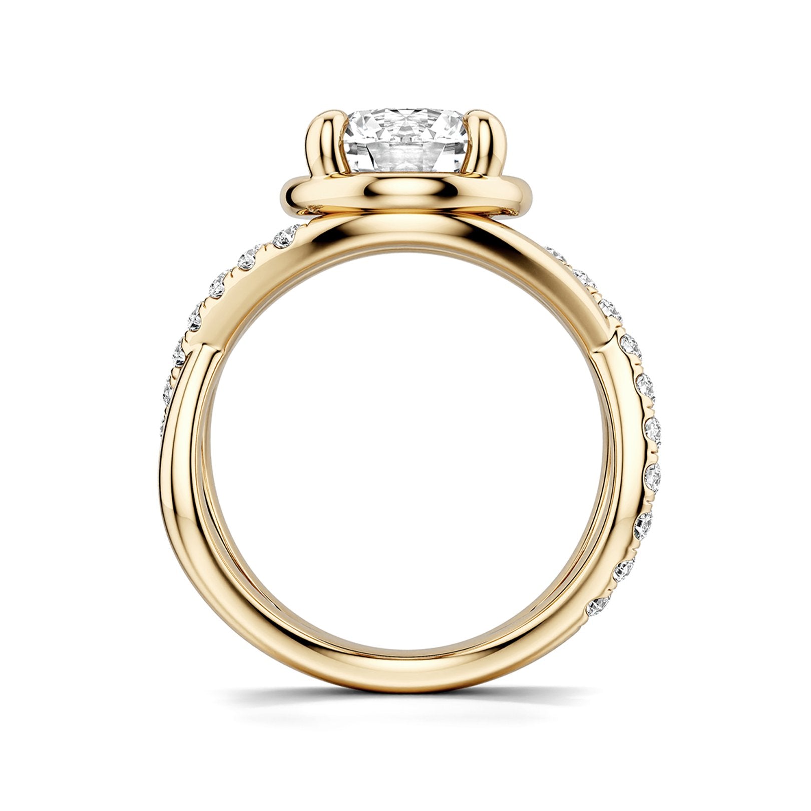 14kt yellow gold Noam Carver infinity-inspired semi-mount ring, designed for a 2.50ct round center. The 2.2mm band features 22 round diamonds totaling 0.46ctw, all 4-prong set and graded GH/SI. Center sold separately. Available by special order in other metals, shapes, and sizes.