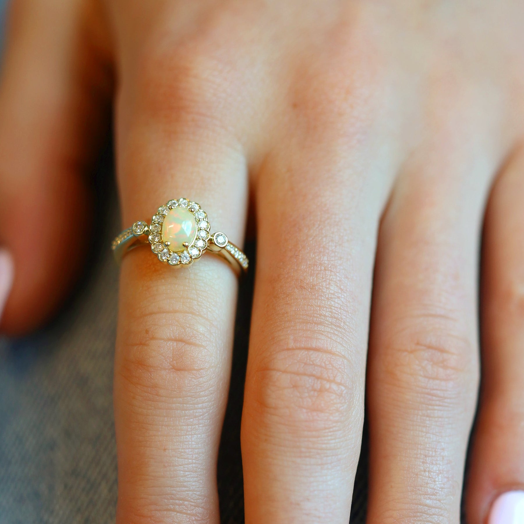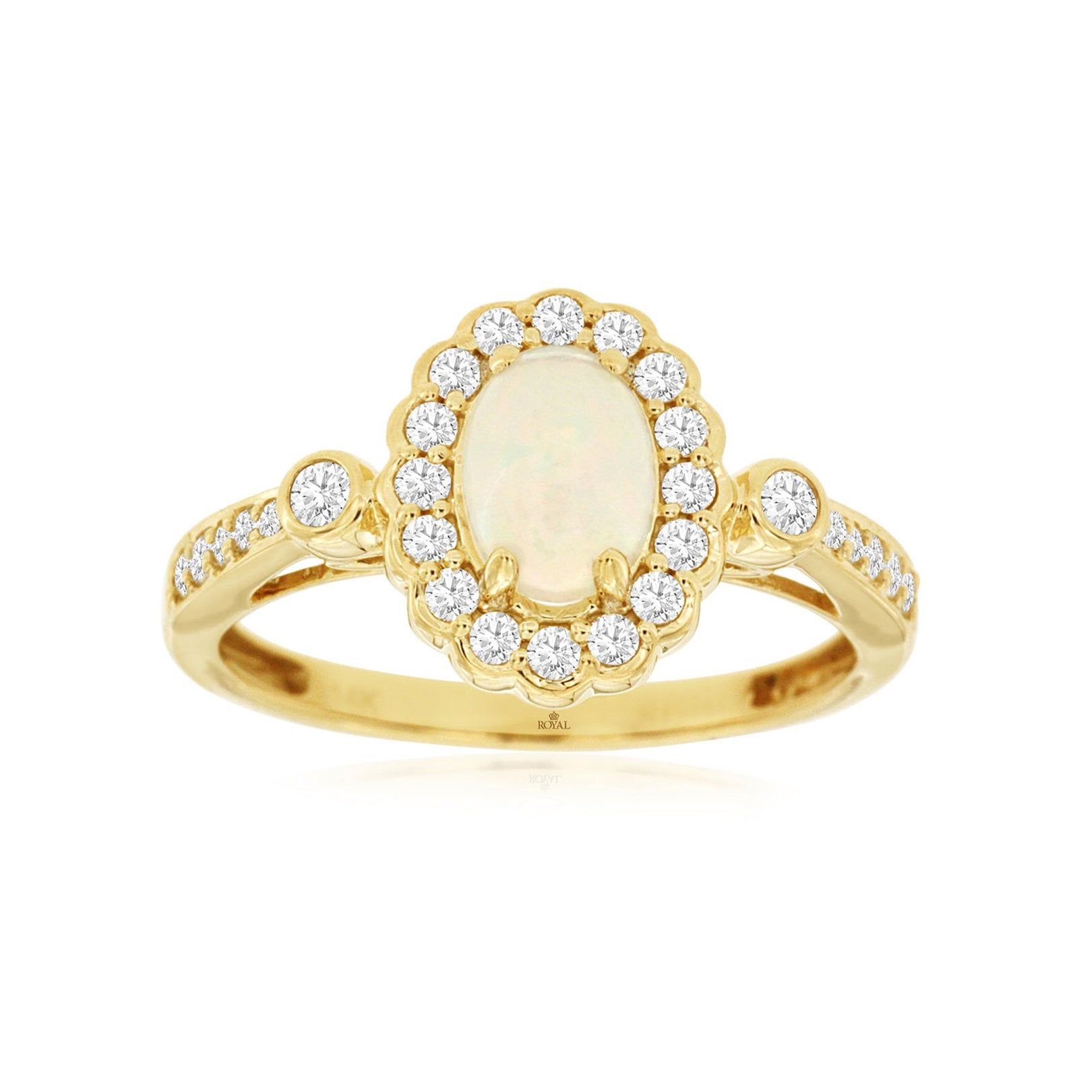 14K yellow gold oval halo ring with one 0.50ct oval opal (4-prong set) and round diamonds totaling 0.34 carats in prong and bezel settings.