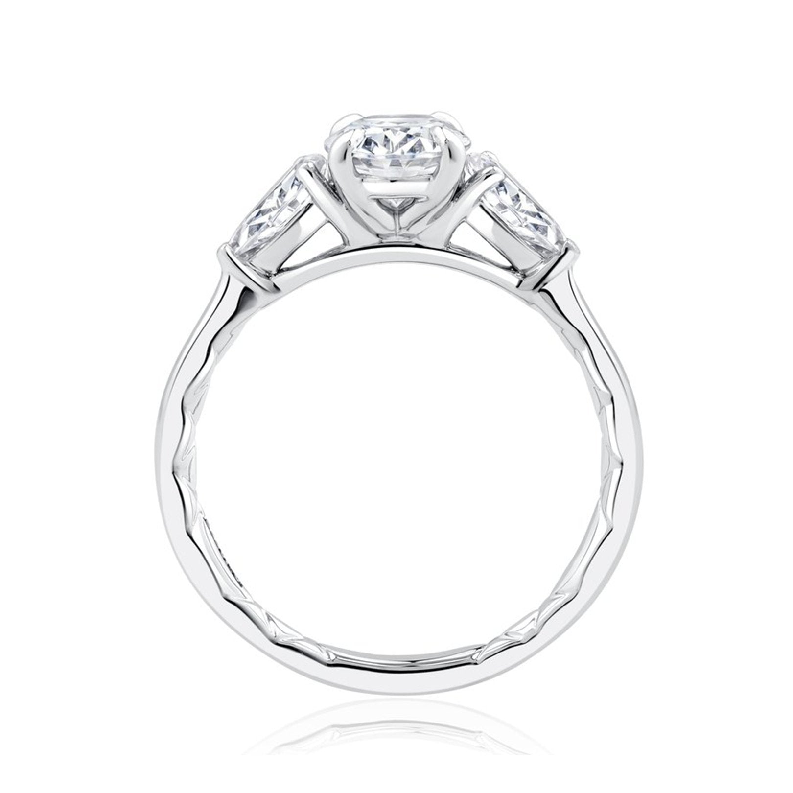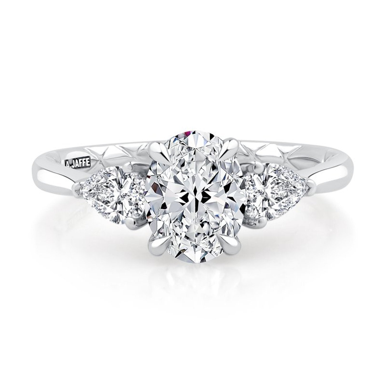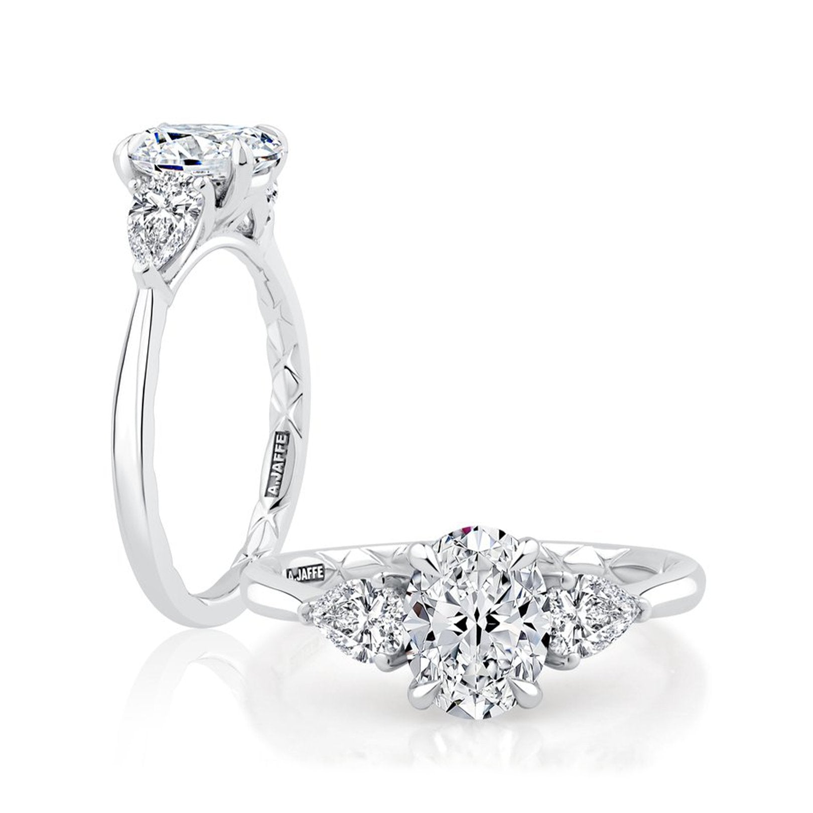 This semi-mount ring is crafted in 18K white gold with a four-prong setting designed to hold a 1.50 carat oval crown size. It is accented with two pear-shaped diamonds totaling 0.60 carats in three-prong settings, graded G color and VS clarity. Available by special order in other metal colors, metal types, diamond shapes, and sizes. Center sold separately.