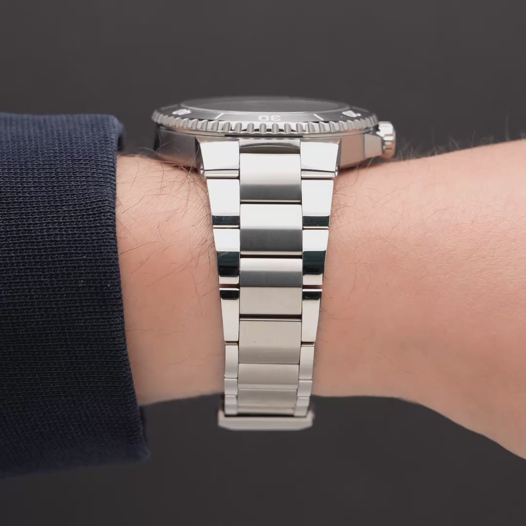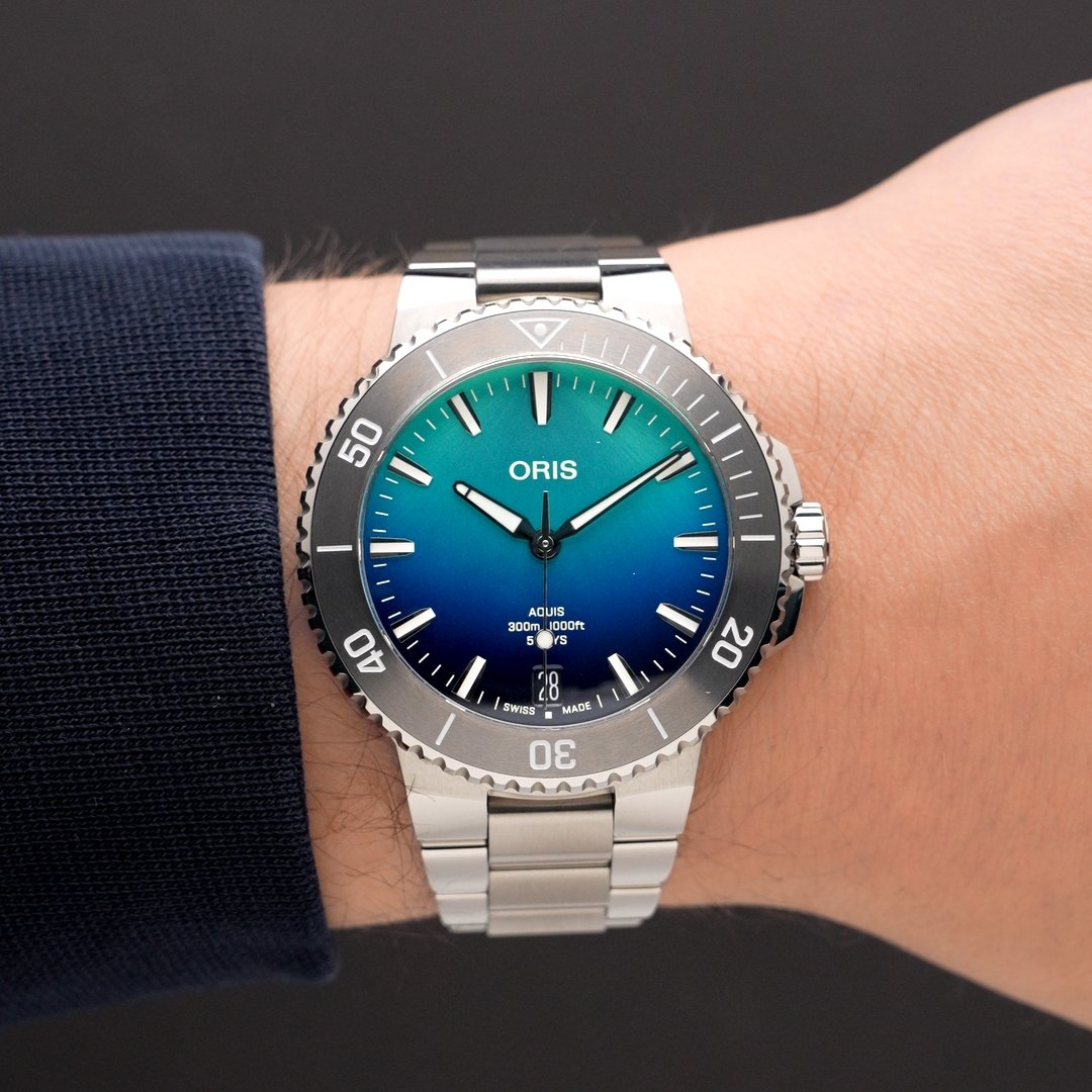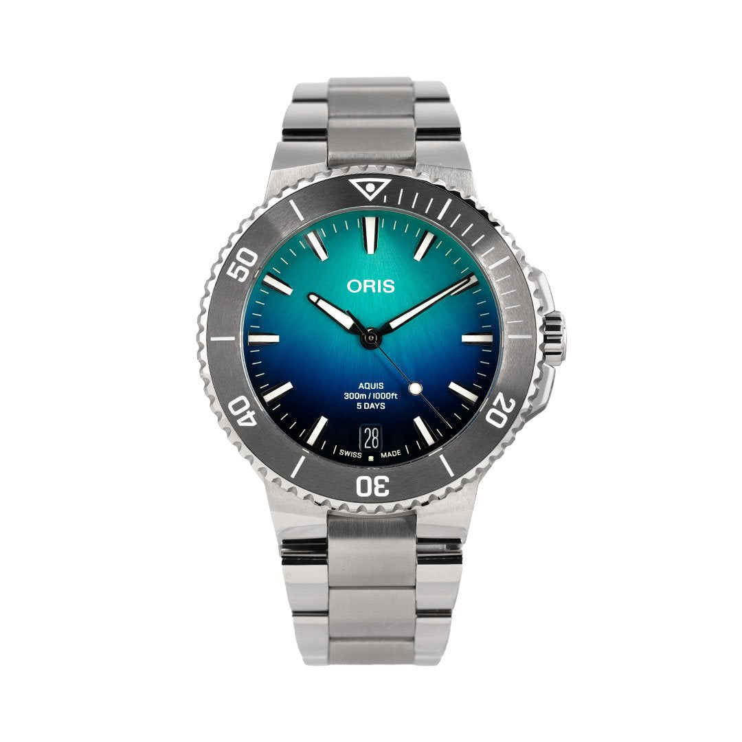 This pre-owned Oris Aquis Great Barrier Reef Limited Edition IV (01 400 7790 4185) is a modern dive watch created to support the preservation of the Great Barrier Reef, produced in a limited run of 2,000 pieces. The stainless steel case is paired with a distinctive blue-to-green gradient dial inspired by ocean depths. A unidirectional rotating bezel adds purposeful dive functionality, while the robust construction ensures 300 meters of water resistance. The watch is powered by the Oris Calibre 400 automatic movement with an impressive five-day power reserve. Finished on a stainless steel bracelet, this model balances contemporary tool-watch engineering with a meaningful environmental mission. Dating to 2024, this example is in excellent condition and includes its original boxes, manuals, tags and certificate.