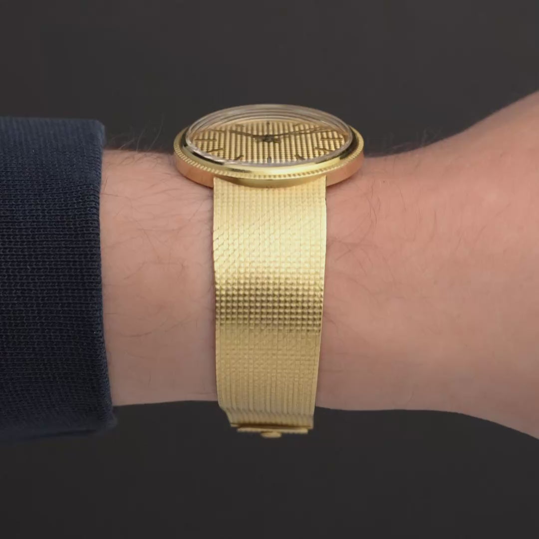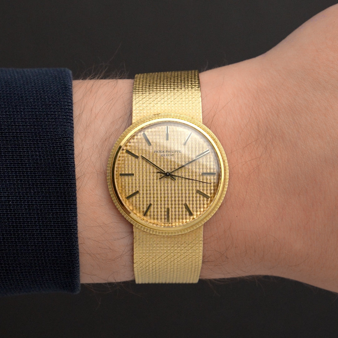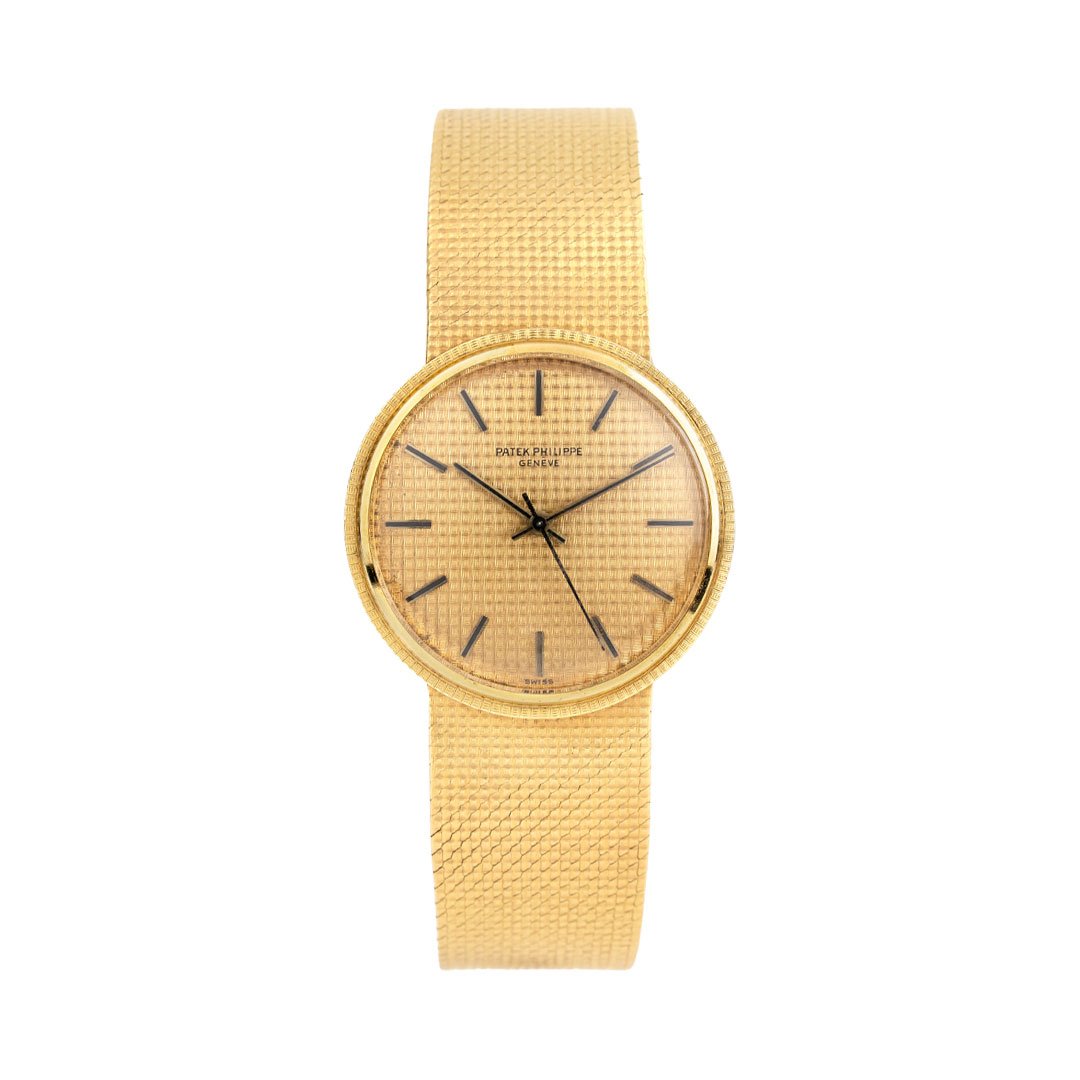 This vintage Patek Philippe Calatrava (Ref. 3563/3) makes a quiet yet powerful statement in 18k yellow gold. Its woven-texture dial flows seamlessly into a matching integrated bracelet, creating a sense of sculptural harmony. A discreet back-wind mechanism maintains the watch’s ultra-slim silhouette—allowing for uninterrupted symmetry across the case. Powered by the self-winding caliber 350, this 1970s-era reference embodies quiet sophistication and enduring artistry. Dating to the 1970's, this watch remains in excellent vintage condition and includes a one-year warranty from Continental Diamond. Sorry, no box or papers.