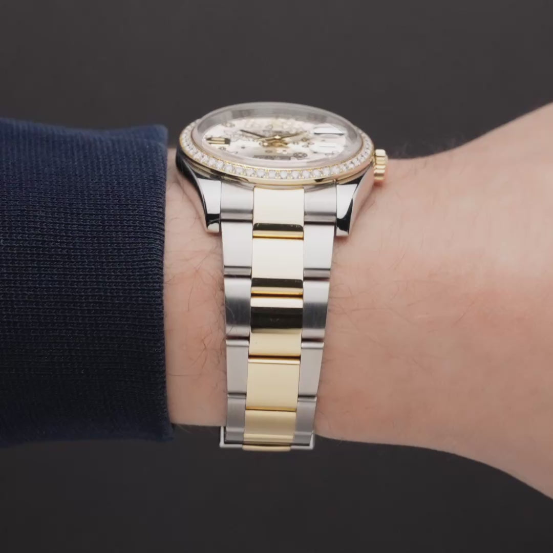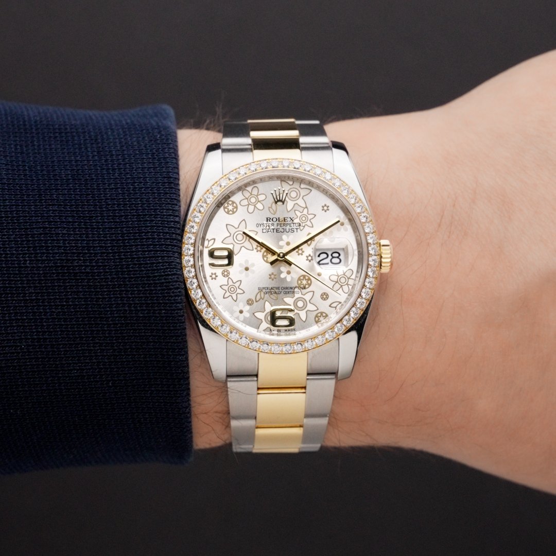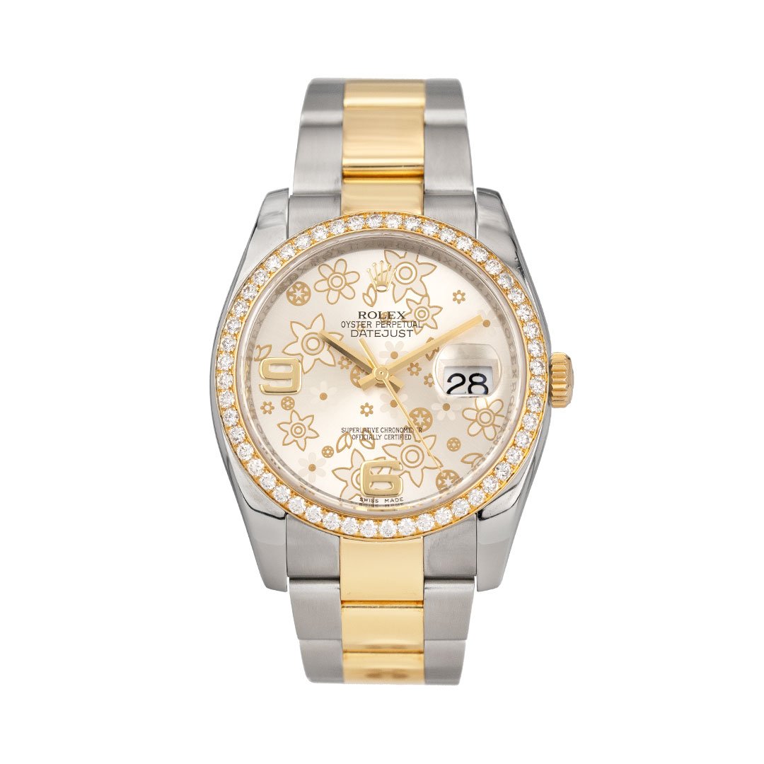 This pre-owned Rolex Datejust 36 (Ref. 116243) showcases a unique floral-motif dial set with diamond hour markers, paired with a factory-set diamond bezel in 18k yellow gold. Housed in a 36mm stainless steel case, it runs on the Calibre 3135 automatic movement, known for its reliability and precision. The watch is fitted with a two-tone 18k yellow gold and stainless steel Jubilee bracelet, offering an elegant balance of artistry and luxury. Sorry, no box or papers.