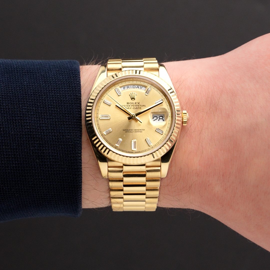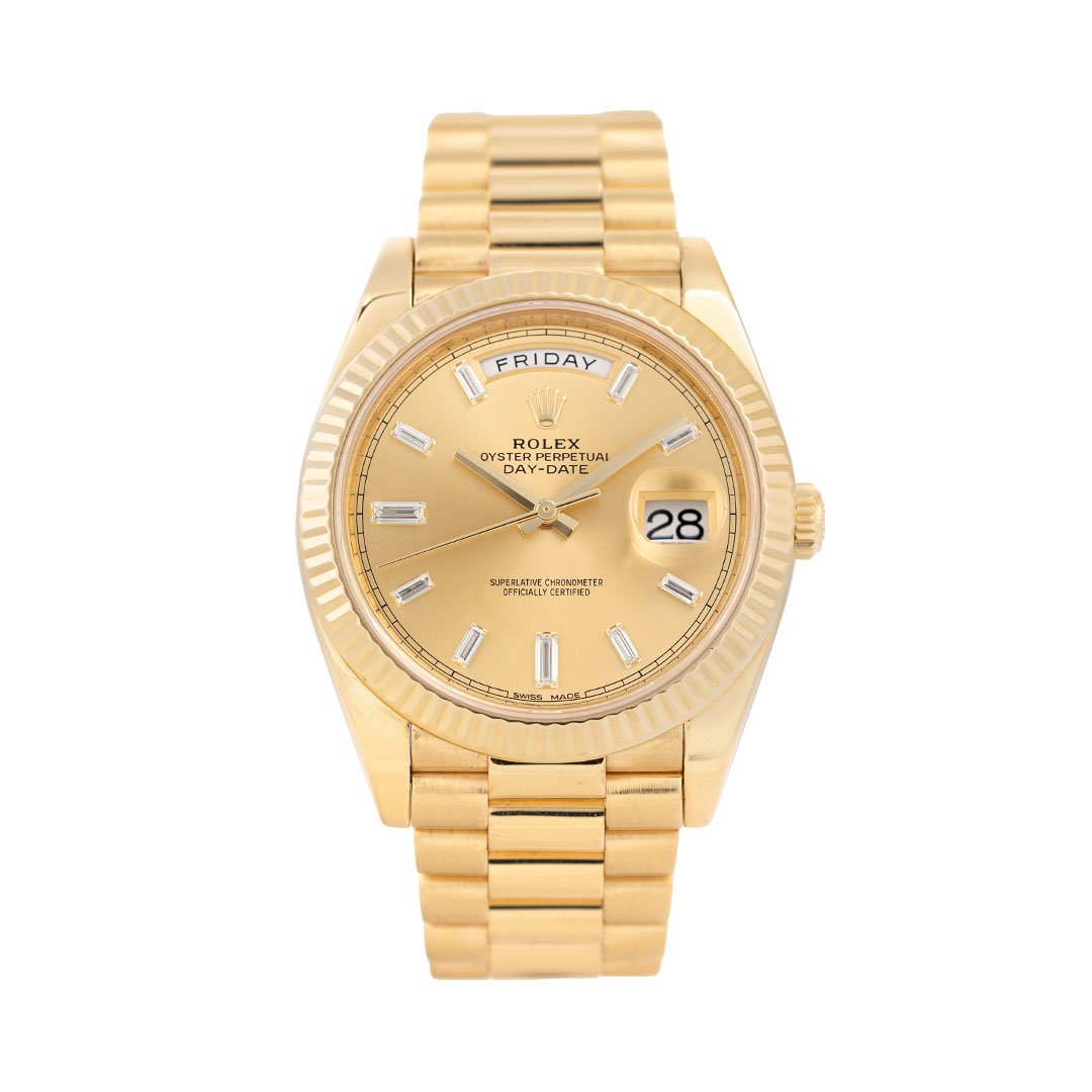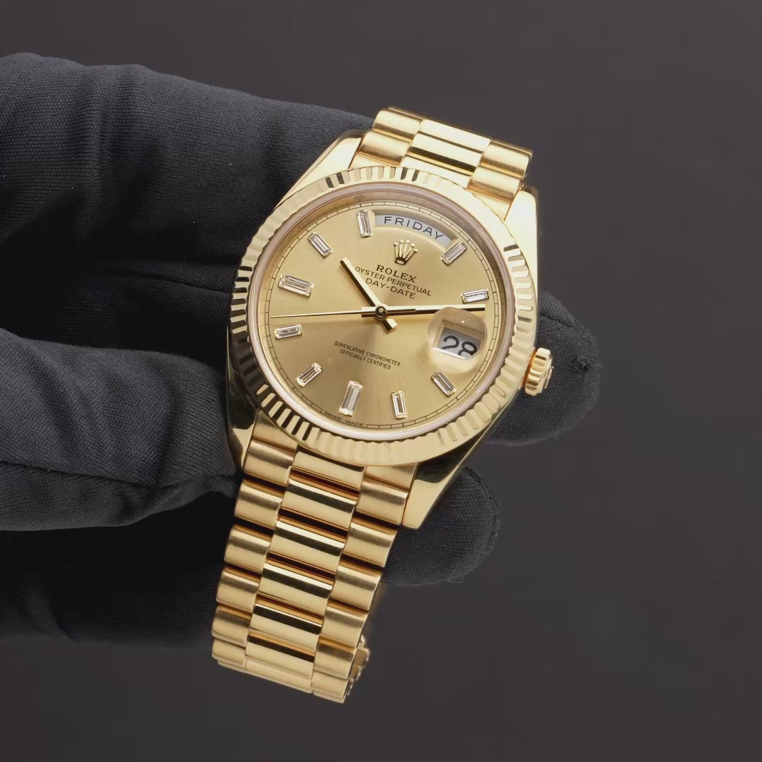 This pre-owned Rolex Day-Date 40 (Ref. 228238) is crafted entirely in 18k yellow gold, pairing the iconic fluted bezel with a champagne dial set with baguette diamond hour markers. The day display at twelve and date at three anchor the model’s signature layout, while the President bracelet delivers the weight and presence the Day-Date is known for. Powered by Rolex’s Calibre 3255 automatic movement, this reference combines modern technical performance with one of the brand’s most enduring and instantly recognizable designs. Dating to 2016 and recently serviced by Rolex, this iconic timepiece is in excellent condition and includes its original boxes, manuals, tag and certificate, and service card. The Rolex Service Guarantee is valid until 09/2026.