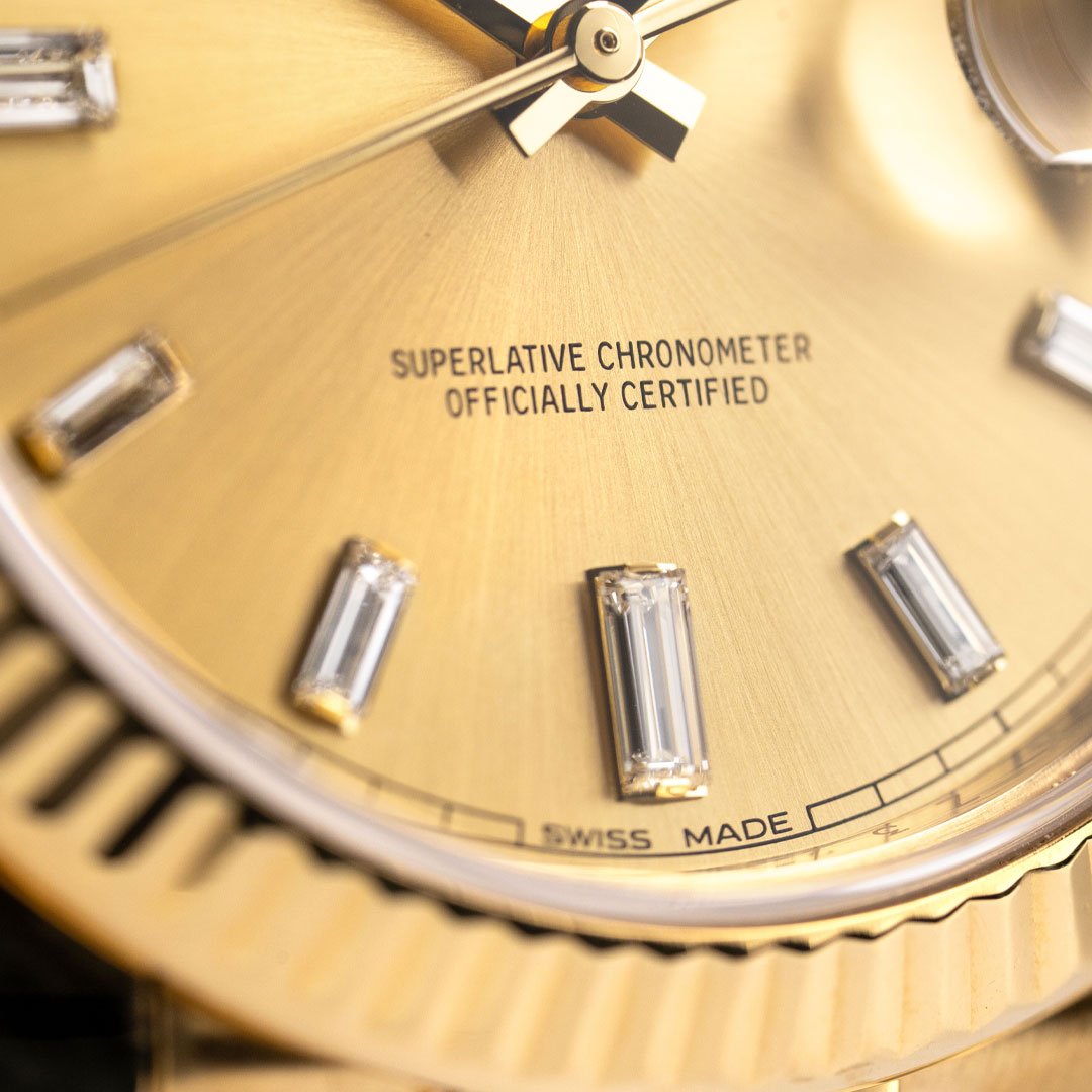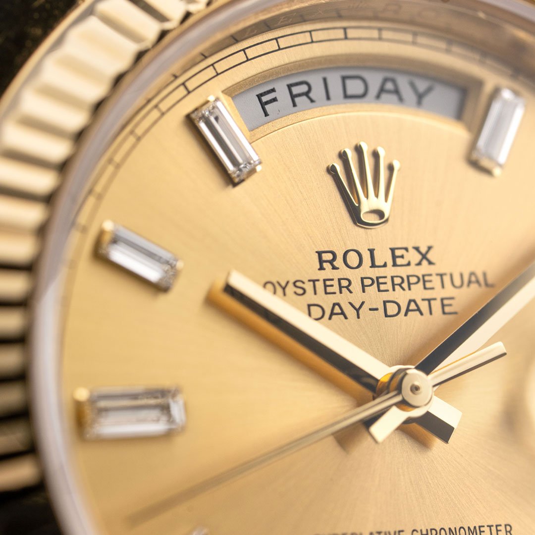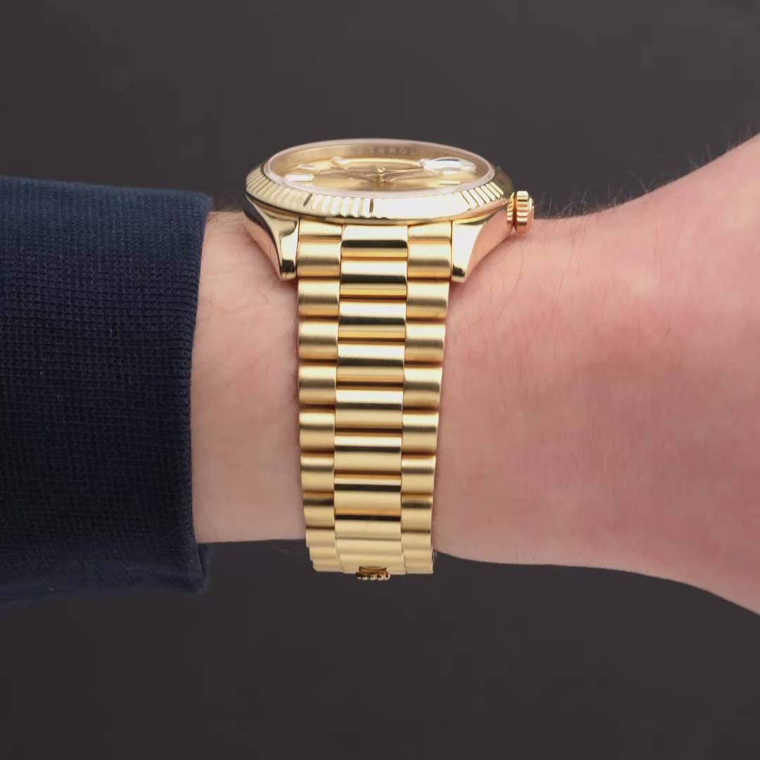 This pre-owned Rolex Day-Date 40 (Ref. 228238) is crafted entirely in 18k yellow gold, pairing the iconic fluted bezel with a champagne dial set with baguette diamond hour markers. The day display at twelve and date at three anchor the model’s signature layout, while the President bracelet delivers the weight and presence the Day-Date is known for. Powered by Rolex’s Calibre 3255 automatic movement, this reference combines modern technical performance with one of the brand’s most enduring and instantly recognizable designs. Dating to 2016 and recently serviced by Rolex, this iconic timepiece is in excellent condition and includes its original boxes, manuals, tag and certificate, and service card. The Rolex Service Guarantee is valid until 09/2026.