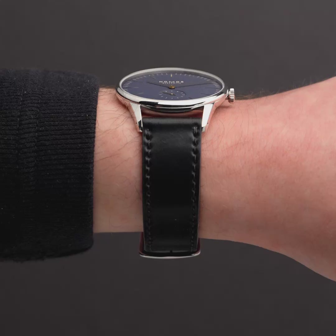 This pre-owned NOMOS Glashütte Orion 38 (Ref. 389) features a refined midnight blue dial with slender stick hour markers and the clean, minimalist aesthetic signature to the Orion collection. Housed in a 38mm stainless steel case, it is powered by the in-house Alpha manual-wind movement, delivering reliable performance with a 43-hour power reserve. The watch is fitted with a black NOMOS Shell Cordovan strap, offering a sleek, comfortable fit that underscores its understated elegance.