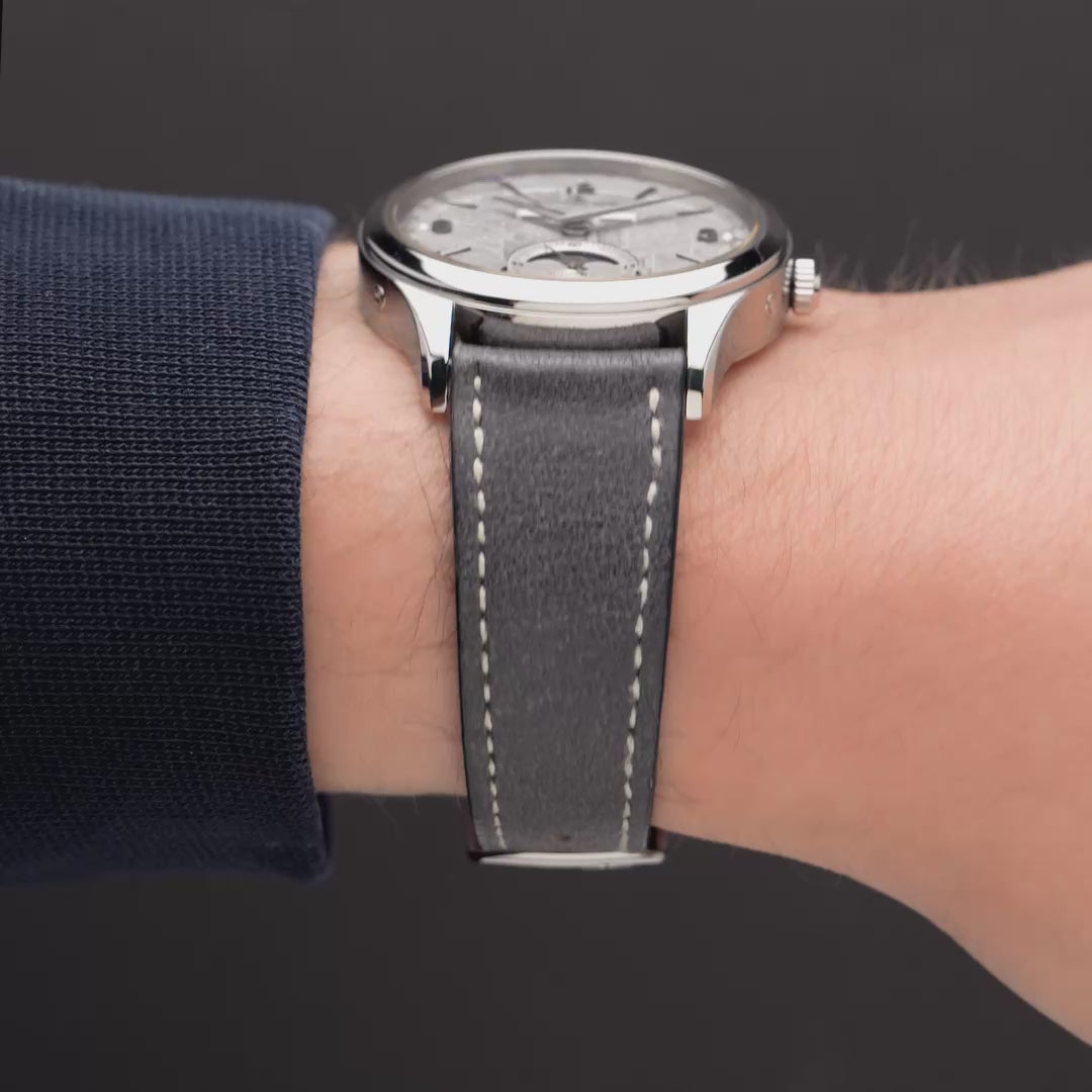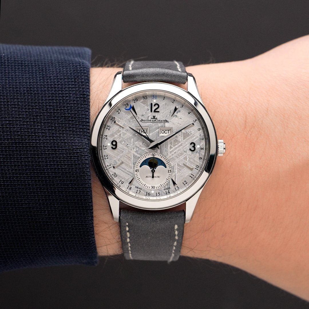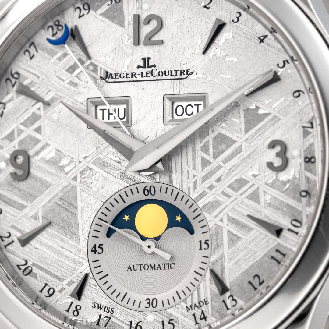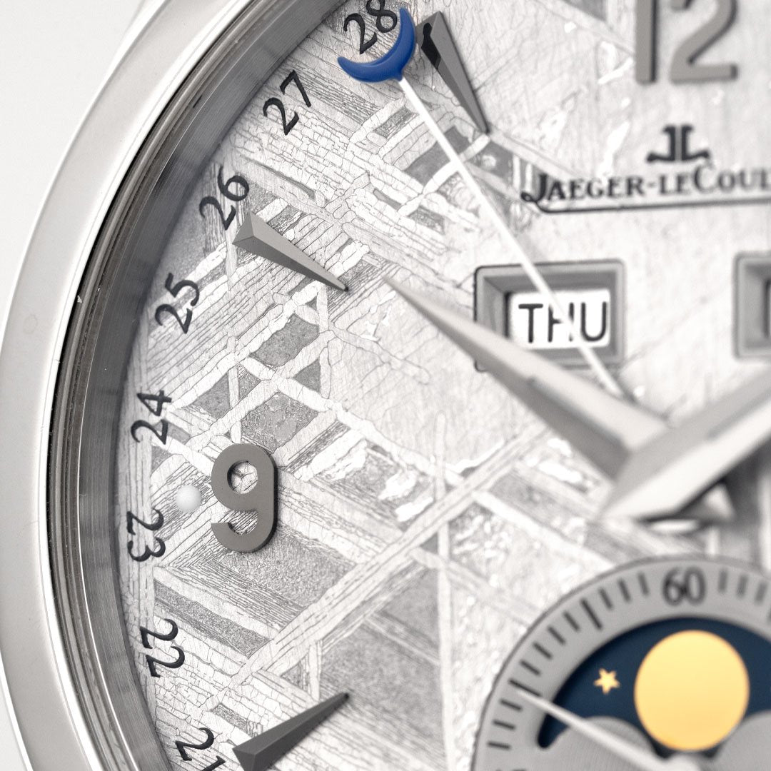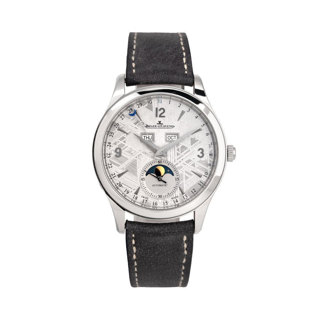 This Jaeger-LeCoultre Master Calendar Meteorite (Q1558421) pairs classical calendar watchmaking with a truly uncommon dial. The 39mm stainless steel case frames a genuine meteorite dial, its natural Widmanstätten pattern giving each example a one-of-a-kind texture that shifts subtly with the light. The automatic Calibre 866/1 drives the full calendar display (day, date, and month) balanced by a moonphase at six o’clock, all arranged with JLC’s characteristic restraint. Finished on a suede-style strap, it’s a refined complication with outer-worldly beauty. Purchased new in 2017 and serviced by JLC in 2023, this rare and spectacular Master Calendar includes its original boxes, manual, certificate, extra straps, and the service receipt.