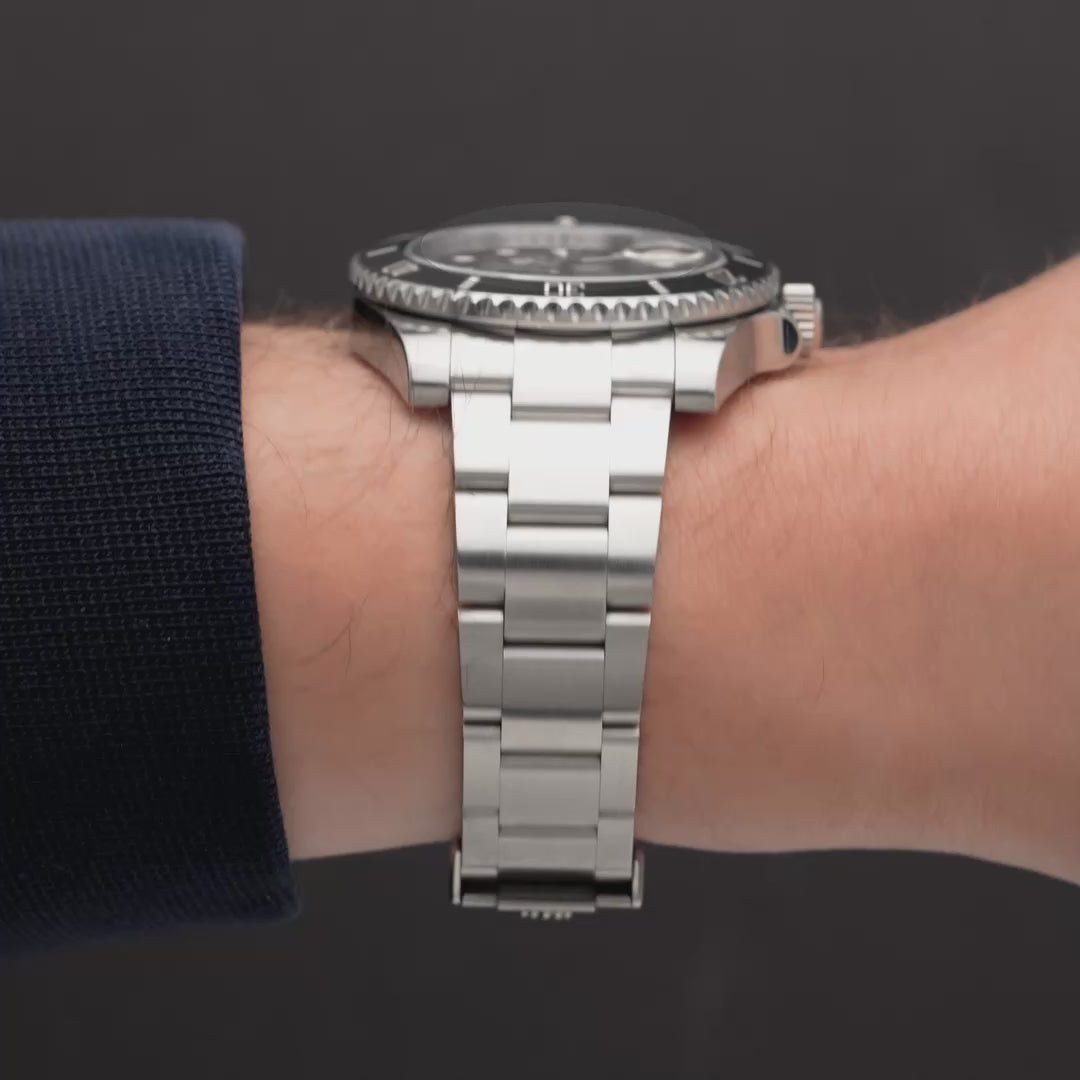 This pre-owned Rolex Submariner Date (Ref. 116610LN) features the classic black dial and matching black Cerachrom bezel that define Rolex’s modern dive watch design. The 40mm stainless steel case offers 300m of water resistance, while the Calibre 3135 automatic movement delivers proven reliability and smooth date functionality. Finished with the robust Oyster bracelet and Glidelock clasp, it’s a versatile, everyday sport watch that is iconic, wearable, and instantly recognizable. Dating to 2015, this Submariner was just serviced and includes its original certificate. Sorry, no box.