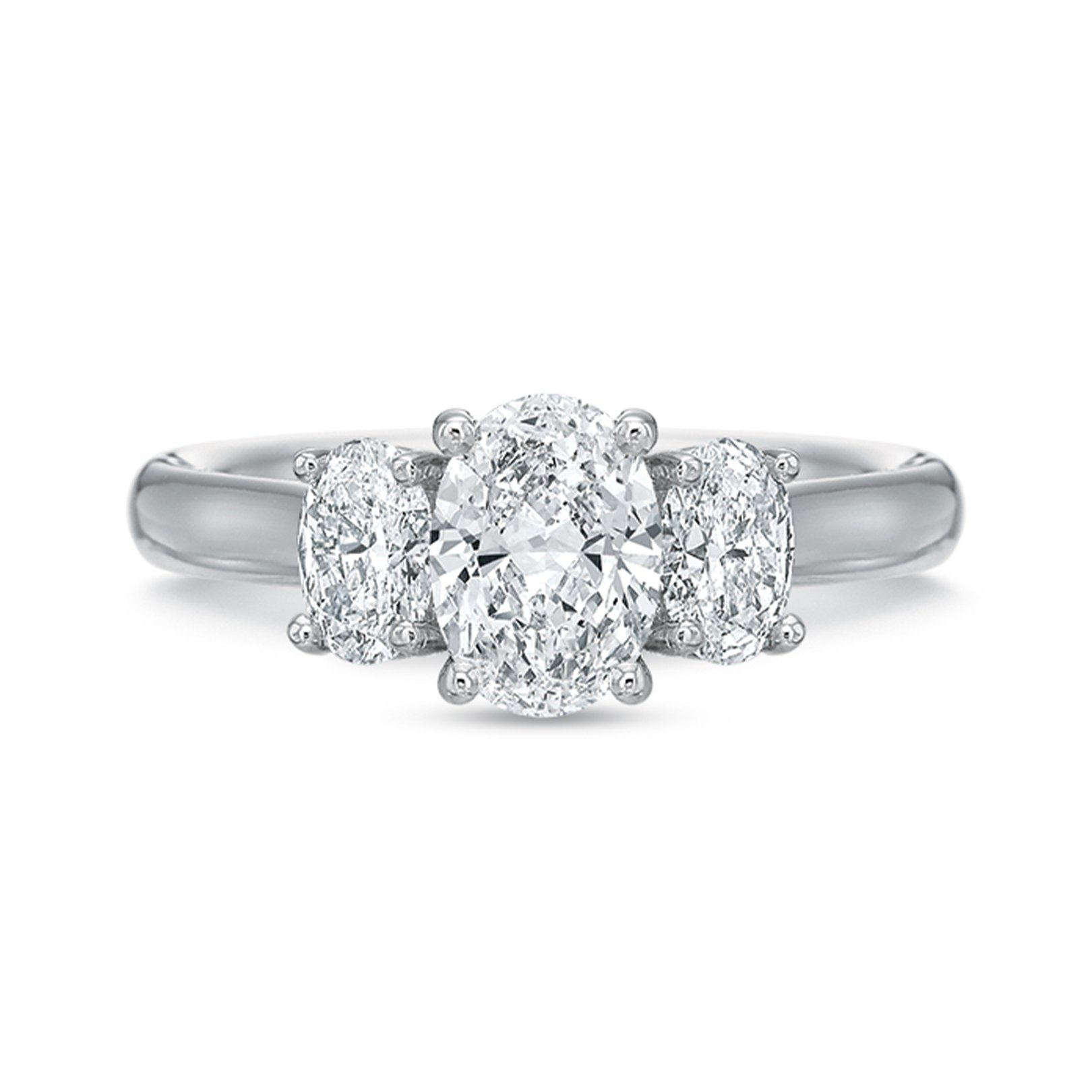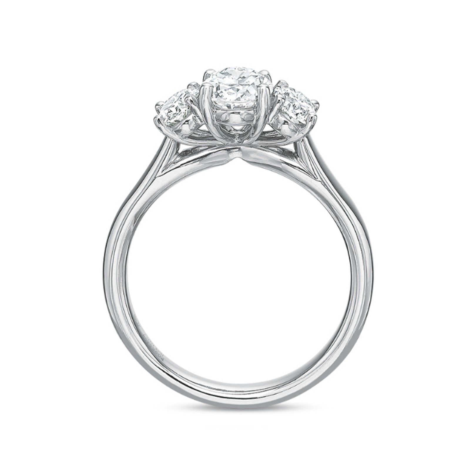 This platinum semi-mount ring is designed for a 2.00ct oval center and features two four-prong–set oval diamonds totaling 0.80ctw (F/VS). Center sold separately. Available by special order in other metals, shapes, and sizes.