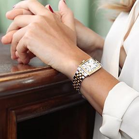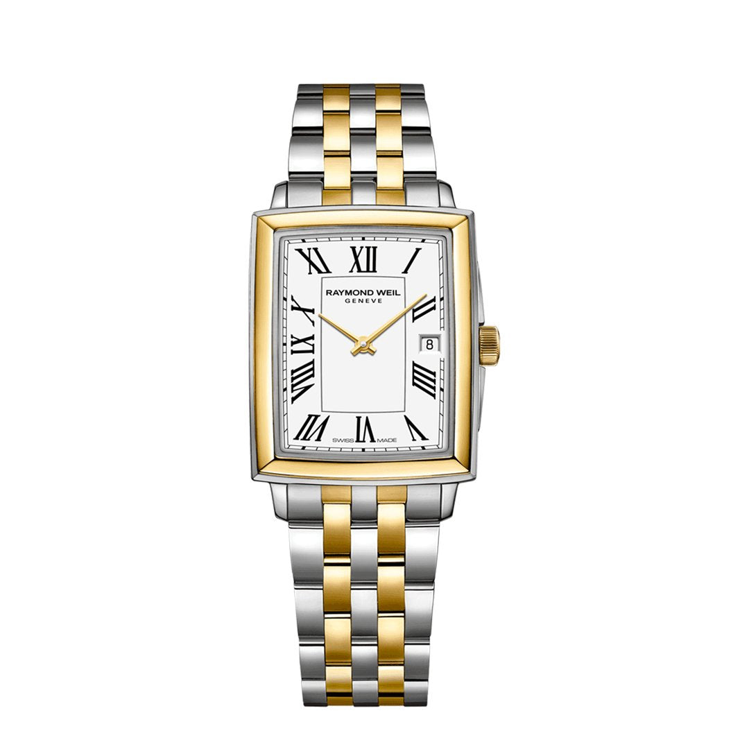Toccata Quartz watch with a 22.6 x 28.1mm two-tone stainless steel and yellow gold PVD rectangular case, white dial with Roman numeral indexes, on a matching two-tone bracelet.