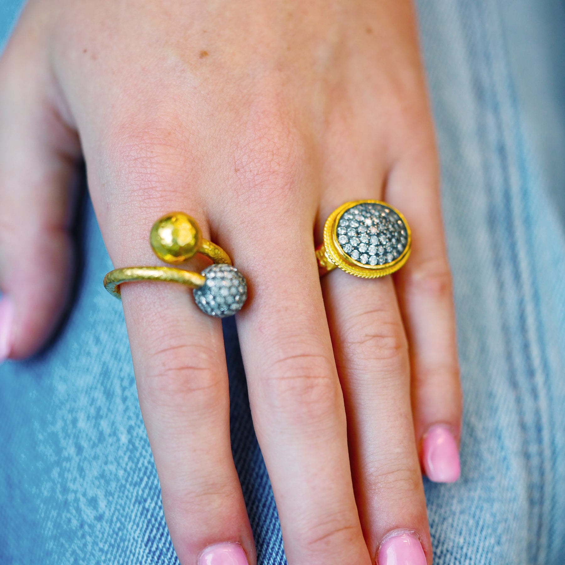24K yellow gold east-west oval ring by Ara featuring 48 pavé-set round diamonds totaling 1.25 carats. Designed with granulation and rope detailing. Ring size 6.50.