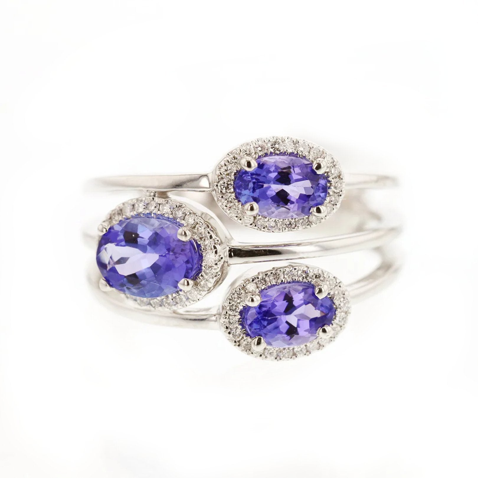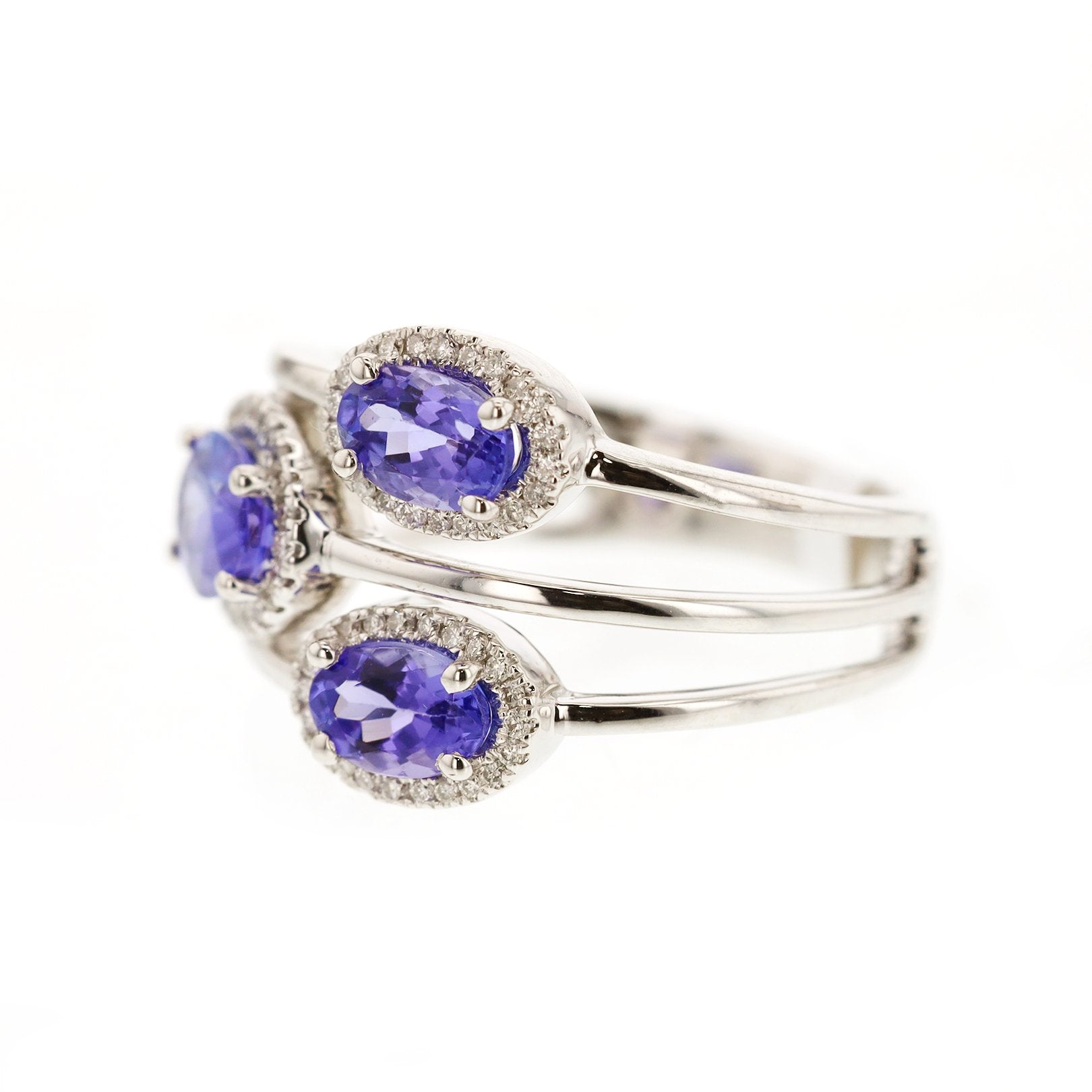 This ring is crafted in 14K white gold with a three-row split shank and oval halo design. It features three oval tanzanites totaling 1.84 carats in four-prong settings, accented by 60 round diamonds totaling 0.20 carats in bead settings. The diamonds are graded GH color and SI clarity.