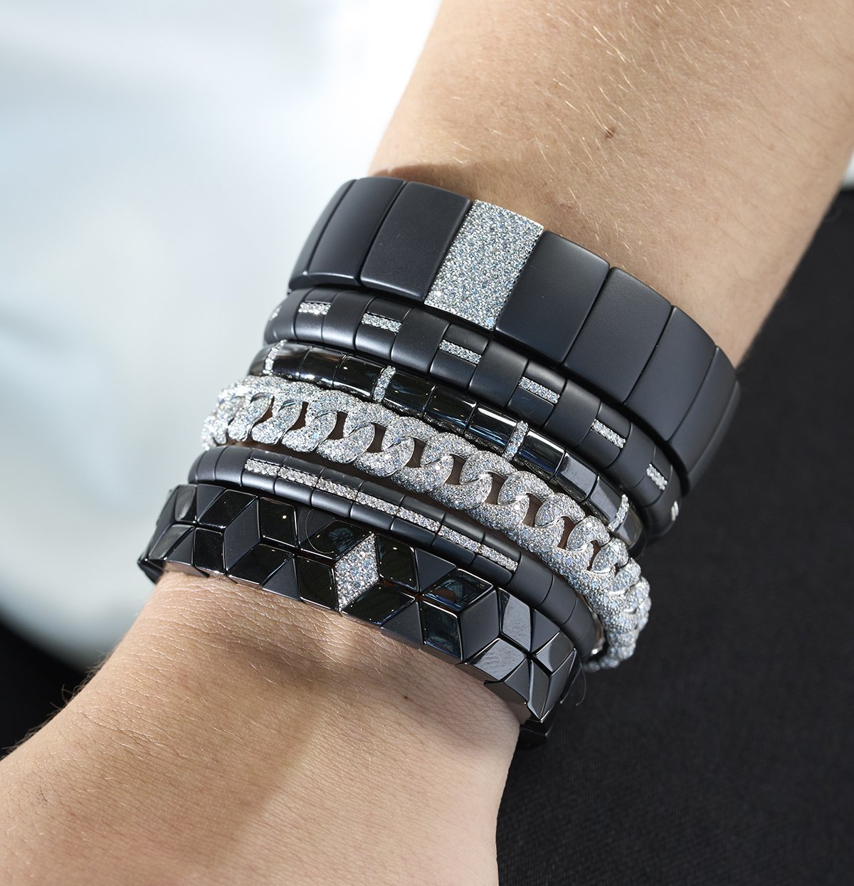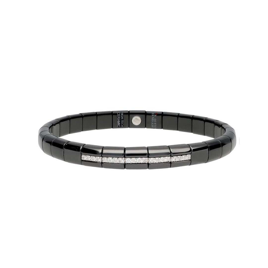 18K white gold 7" black ceramic bracelet by Roberto Demeglio, featuring 5 diamond sections with 20 shared prong-set round diamonds totaling 0.18ctw, G color, VS2–SI1 clarity.