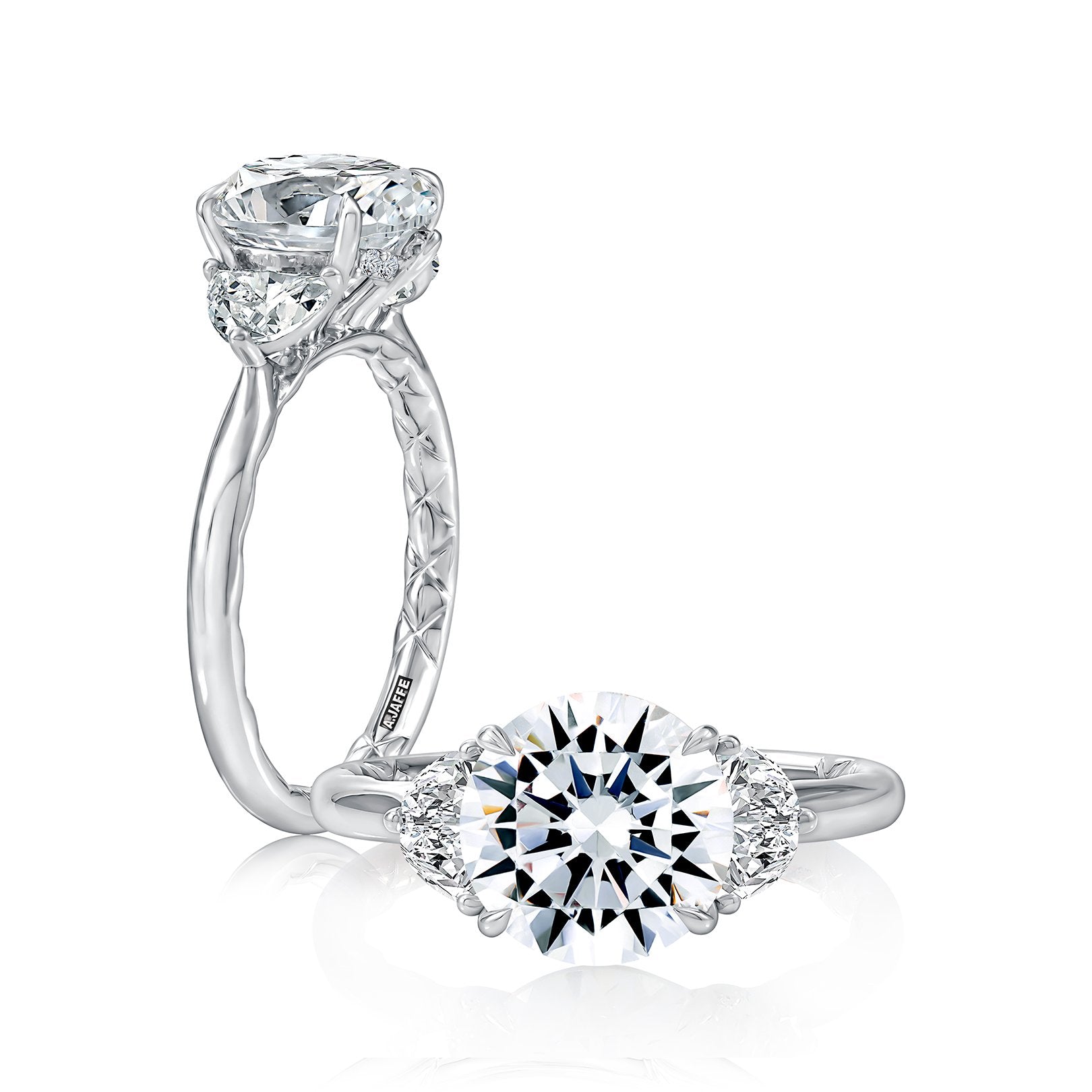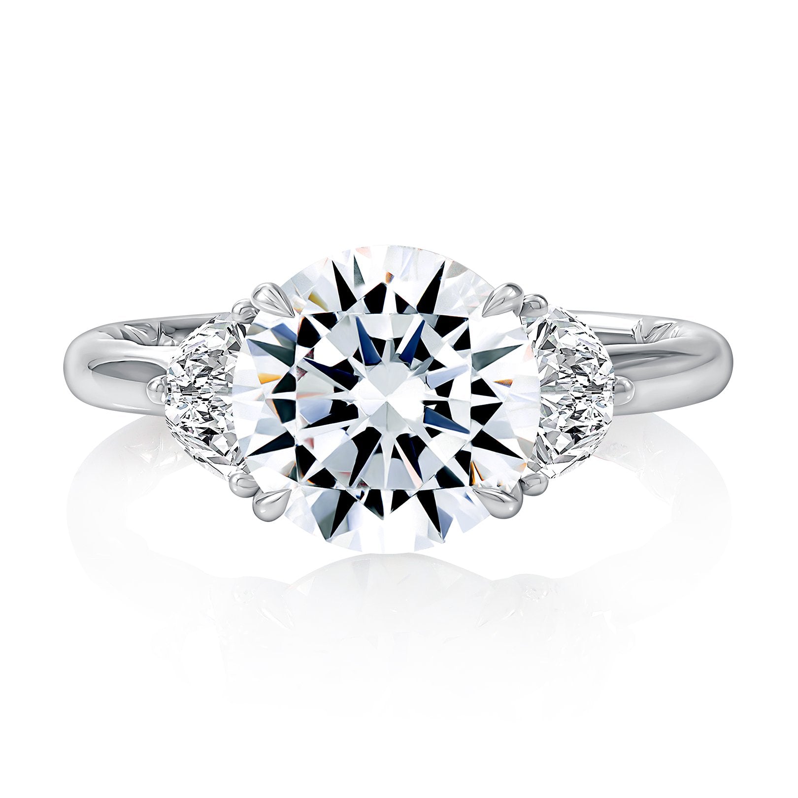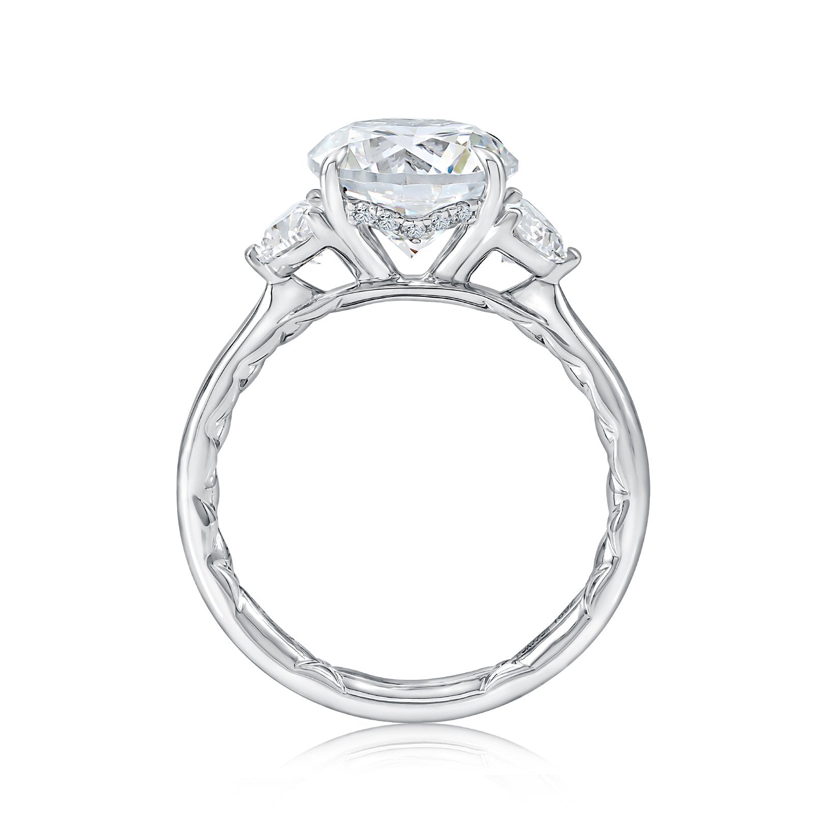14K White Gold 4-Prong Hidden Halo Quilt Semi-Mount Ring featuring a 3.00ct round crown size setting. Accented with 2 half-moon diamonds totaling 0.66ctw in 3-prong settings and 10 prong-set round diamonds totaling 0.005ctw for subtle brilliance. In-store ring is a sample. Available by special order only. Other metal colors, types, diamond shapes, and sizes are also available by special order. Center sold separately.