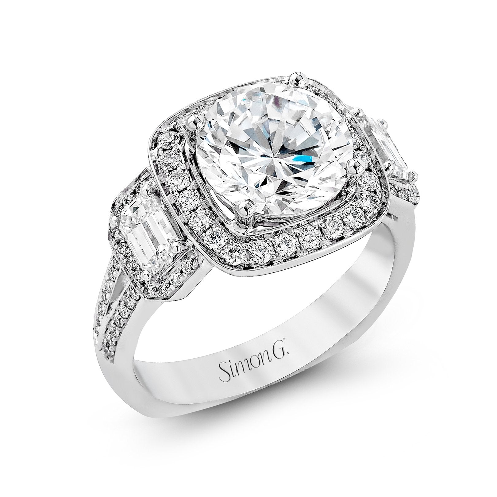18K white gold cushion halo Euro shank semi-mount ring designed for a 2.25ct round diamond. Features 90 prong-set round diamonds totaling 0.46ctw and two 4-prong-set emerald cut diamonds totaling 0.53ctw, G–H/VS2 quality.