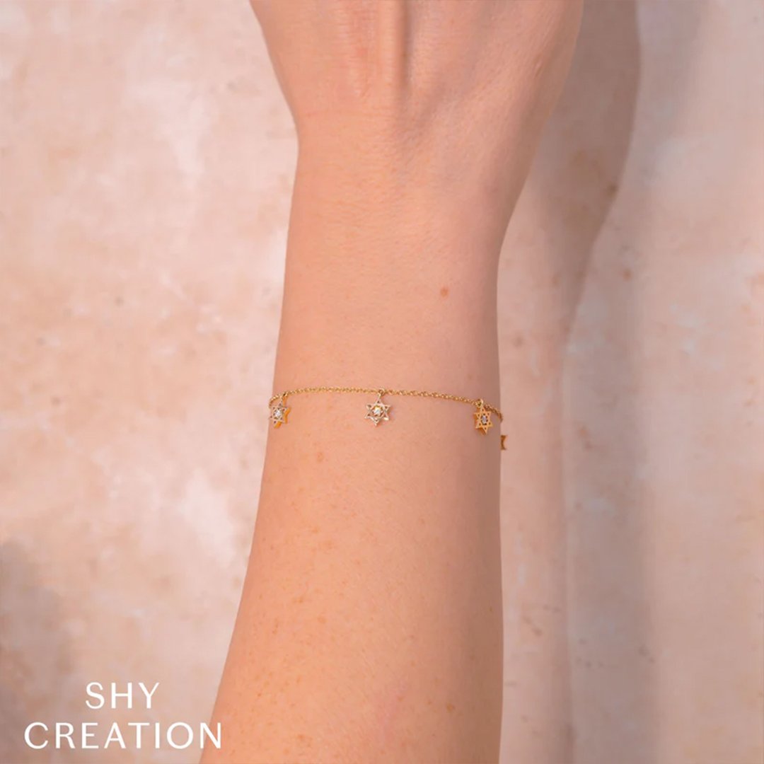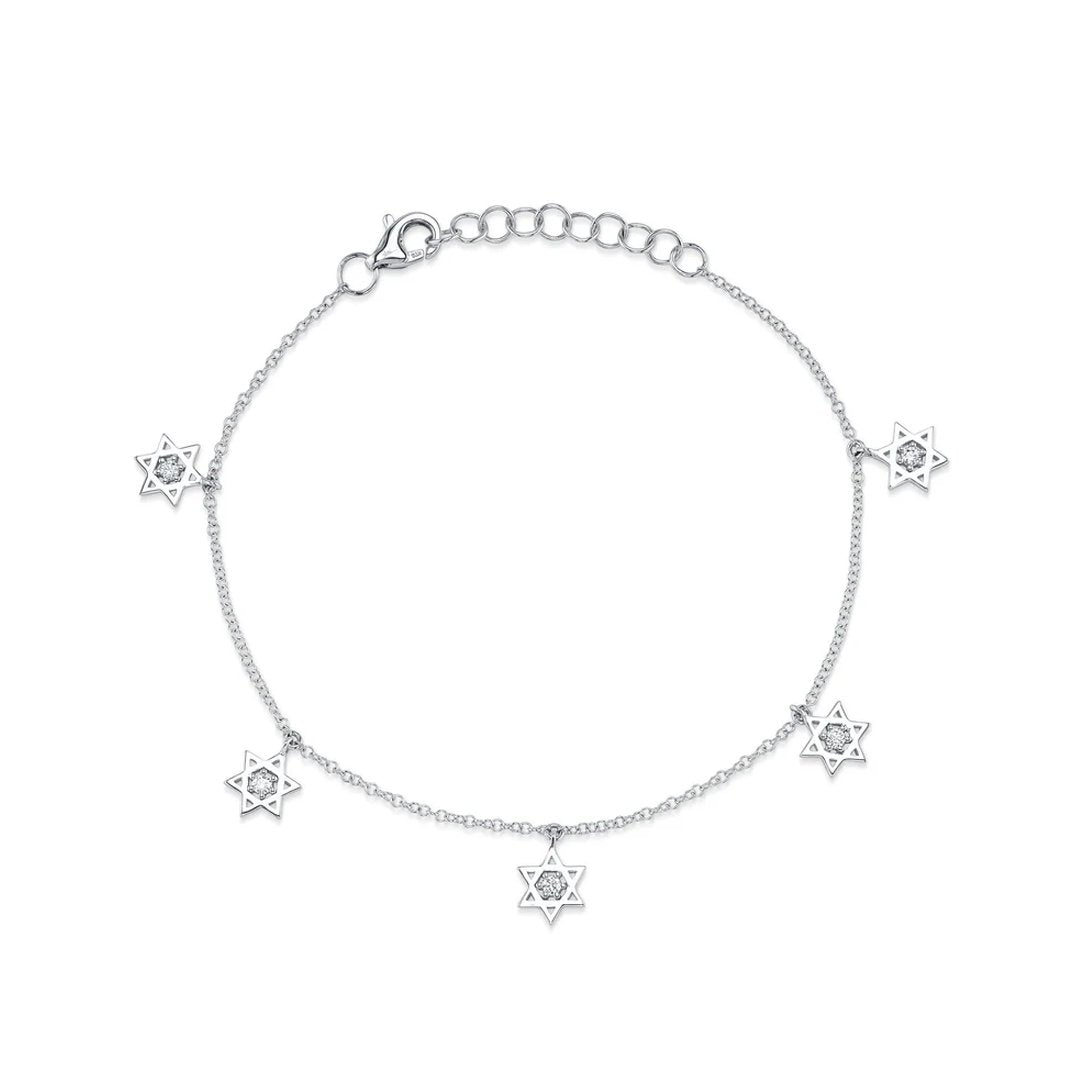 7" Star of David charm bracelet in 14K white gold featuring 5 prong-set round diamonds totaling 0.11ctw (G-H color, SI clarity).