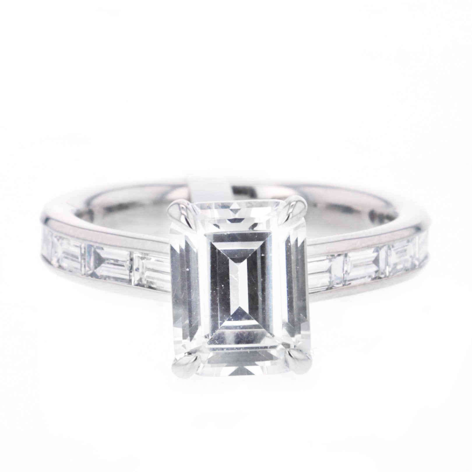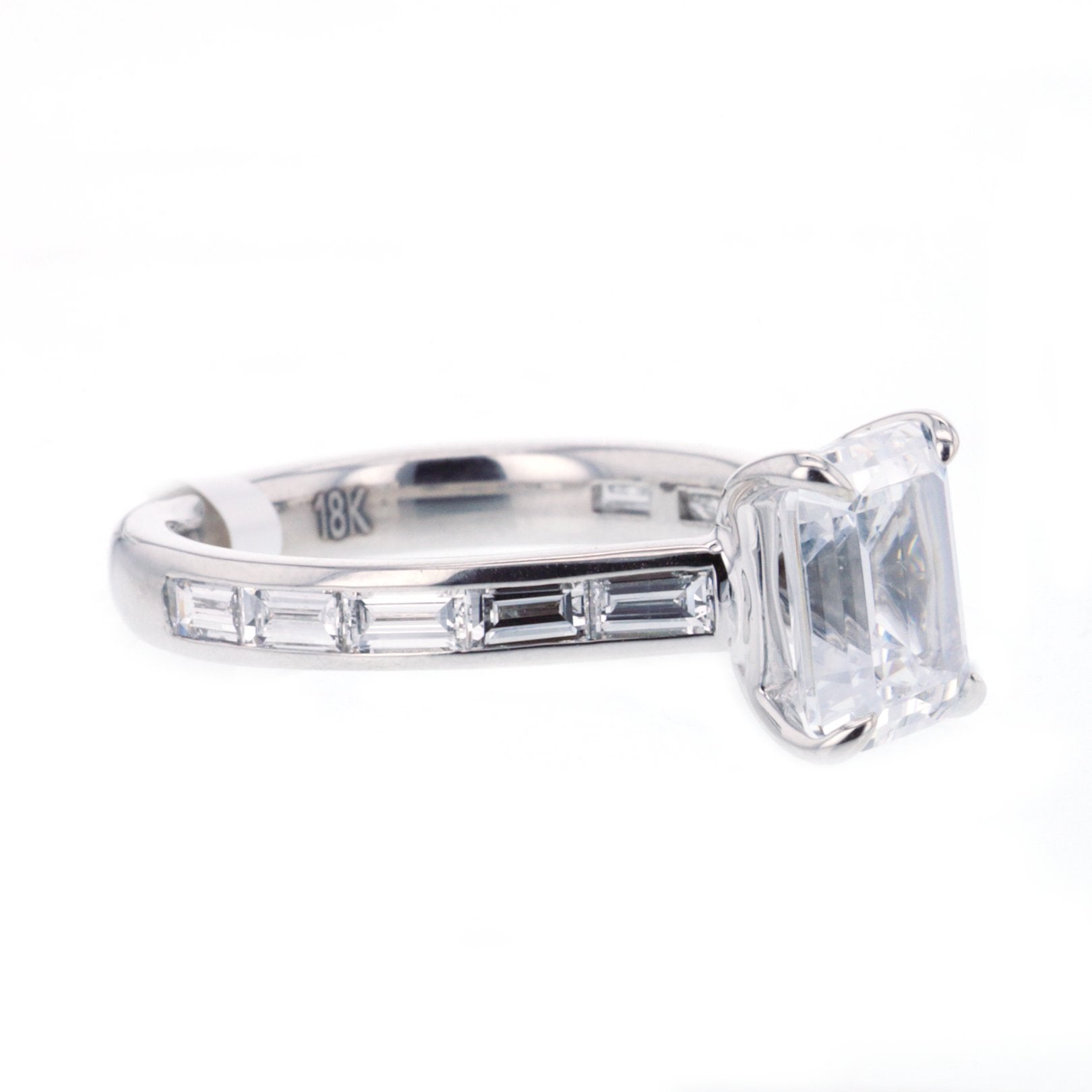 This 18K white gold semi-mount ring, designed for a 2.50ct emerald-cut center, features 10 channel-set baguette diamonds totaling 0.85ctw (FG/VS). Part of the Signature Collection by Continental Diamond. Center sold separately. Available by special order in other metals, shapes, and sizes.