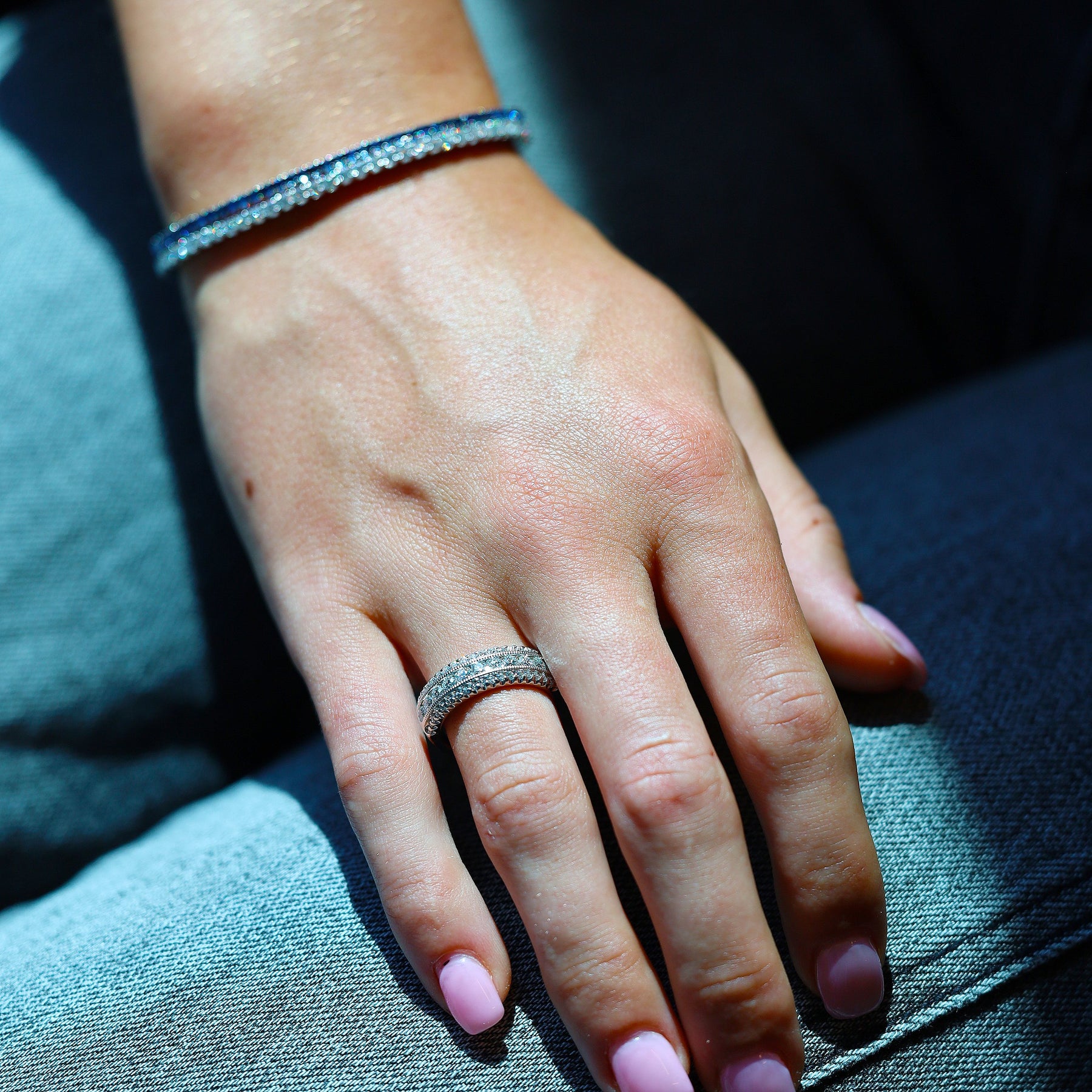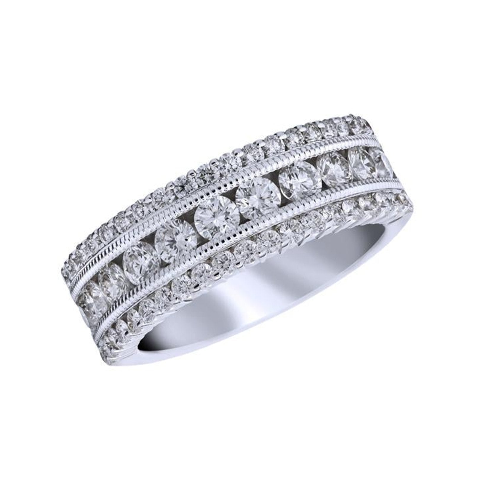 This 14K white gold three-row milgrain band features 49 round diamonds totaling 1.02 carats. Diamonds are channel and prong set, with GH color and VS clarity. Part of the Signature Collection by Continental Diamond.