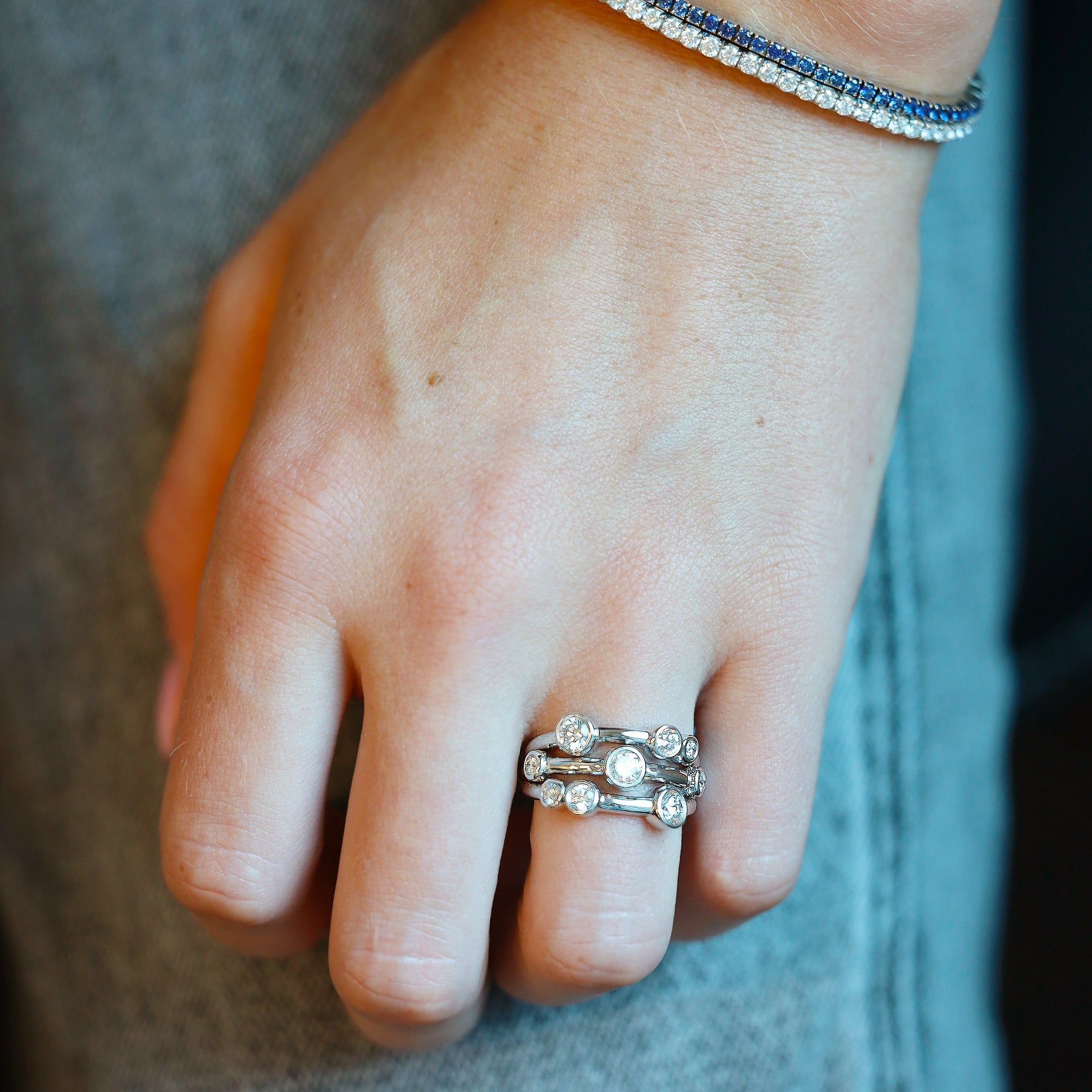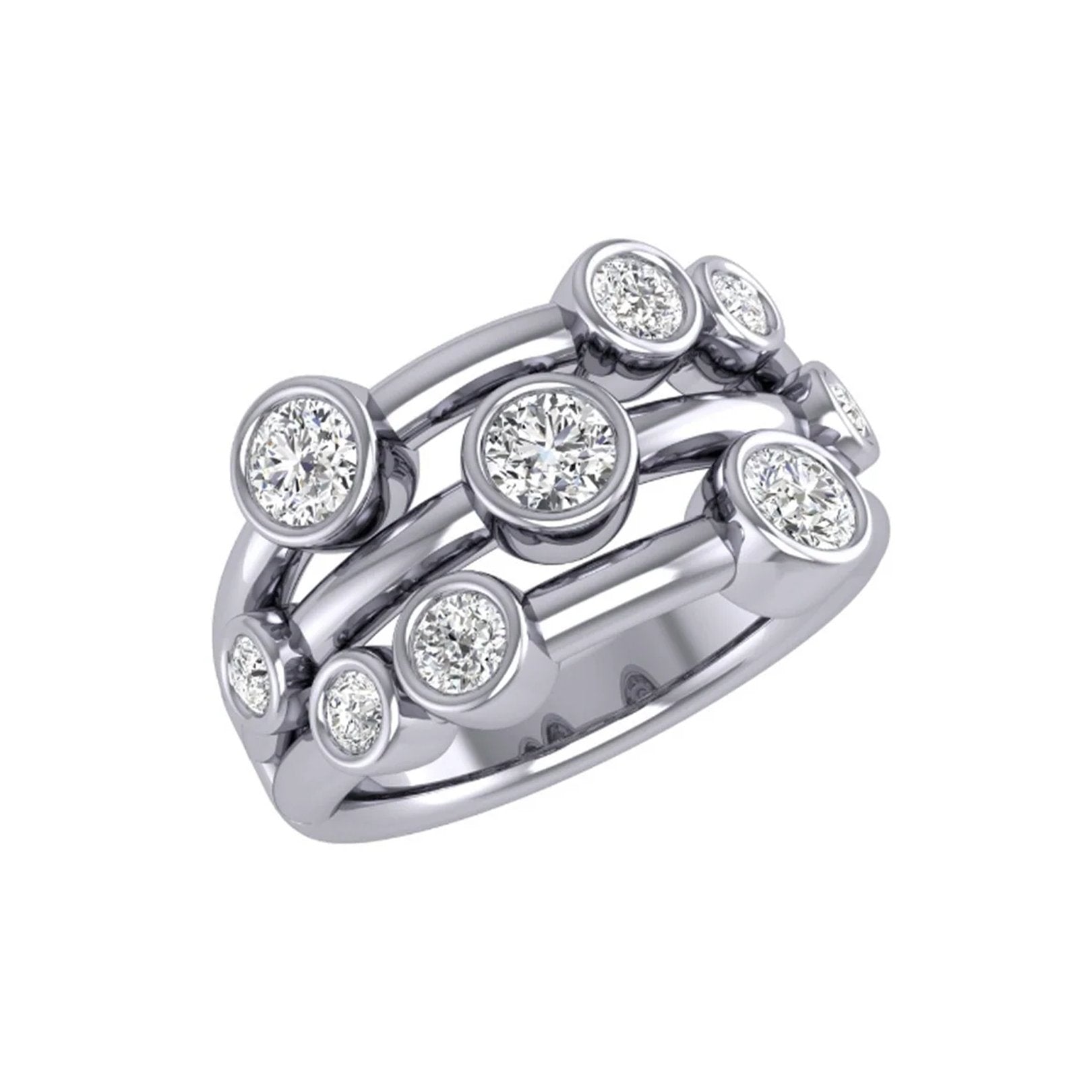 This 18K white gold three-row split shank band features 9 bezel-set round diamonds totaling 1.10 carats. Diamonds are GH color and VS clarity. Part of the Signature Collection by Continental Diamond.