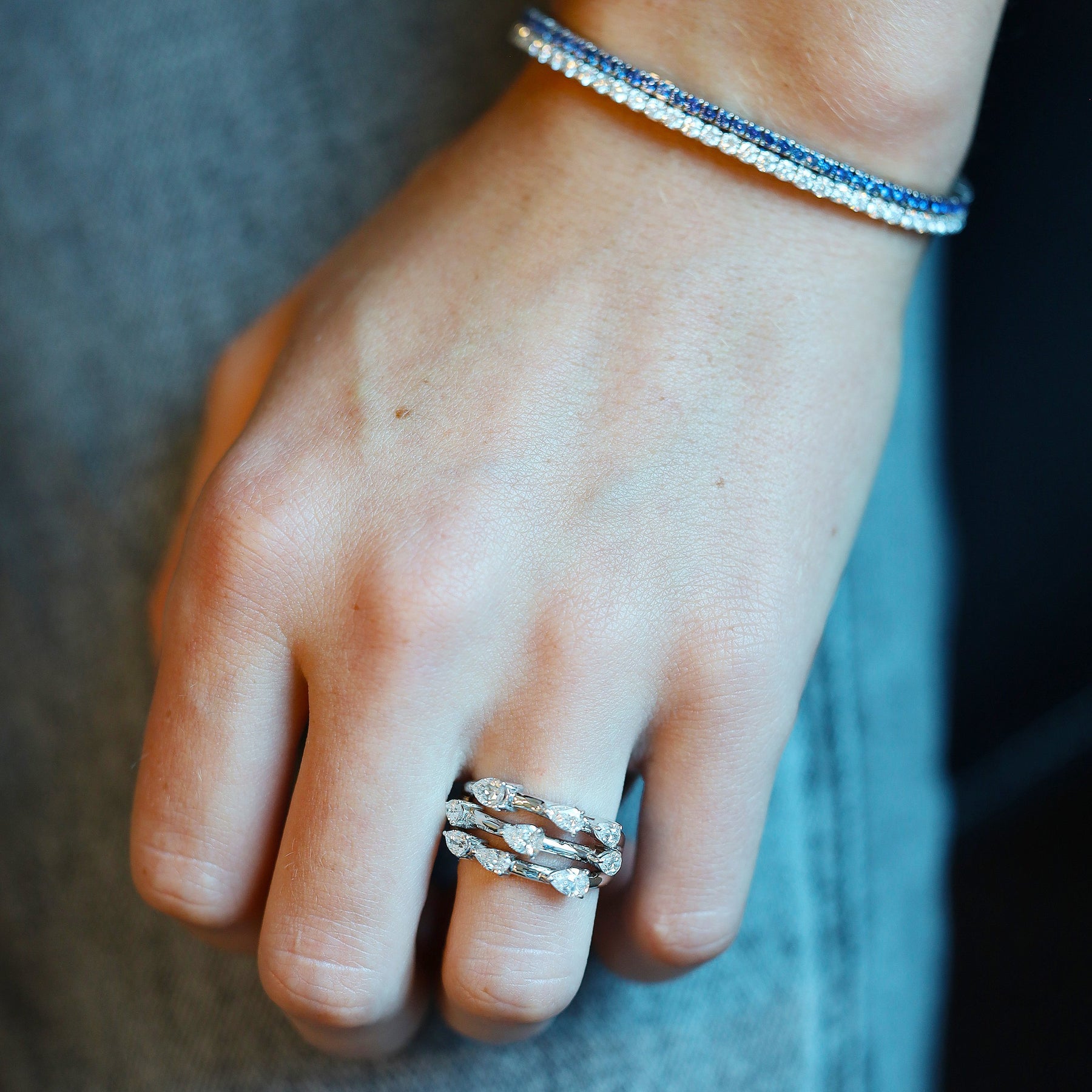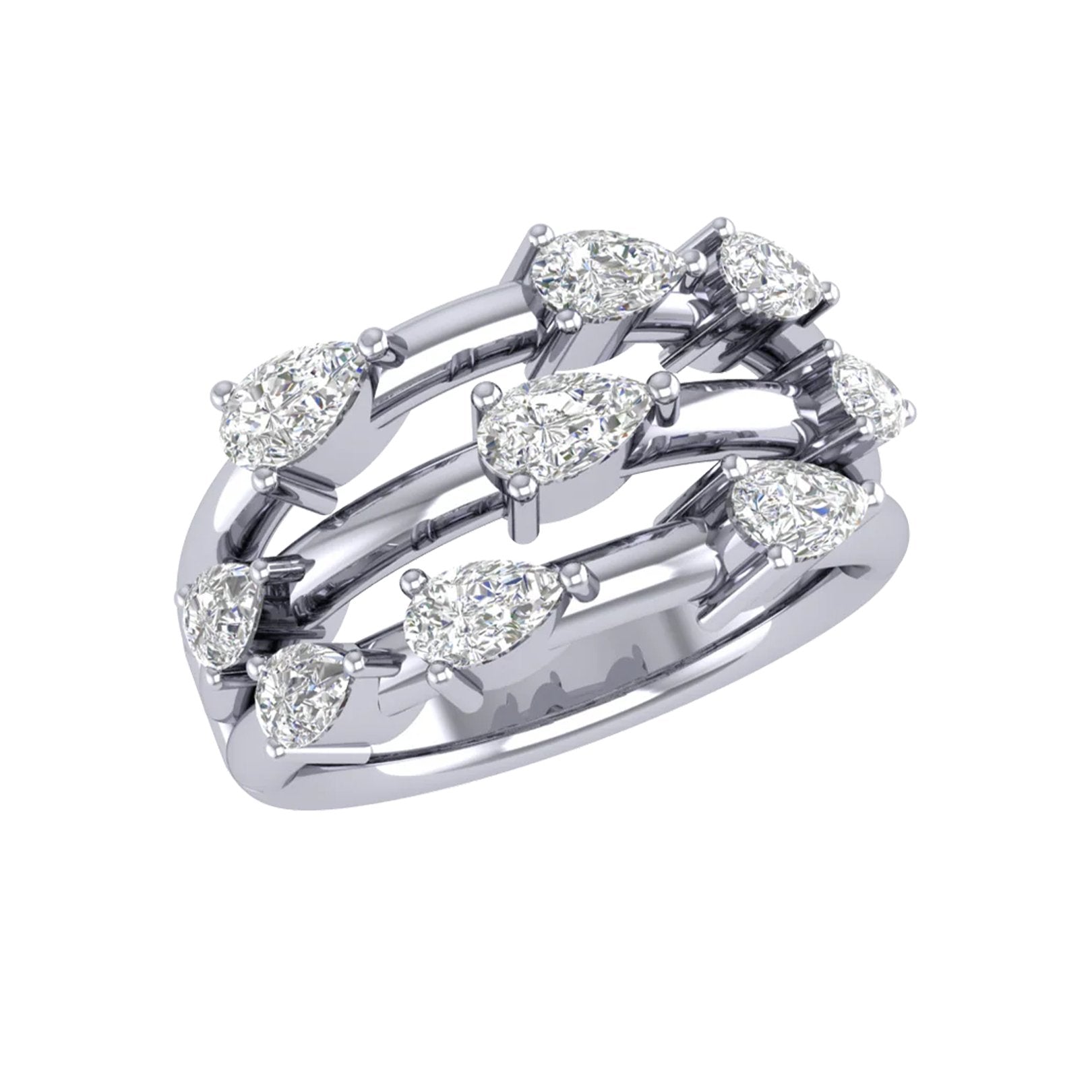This 14K white gold three-row split shank band features nine pear-shaped diamonds totaling 1.52 carats, each set in a three-prong setting. Diamonds are FG color and VS clarity. Part of the Signature Collection by Continental Diamond.