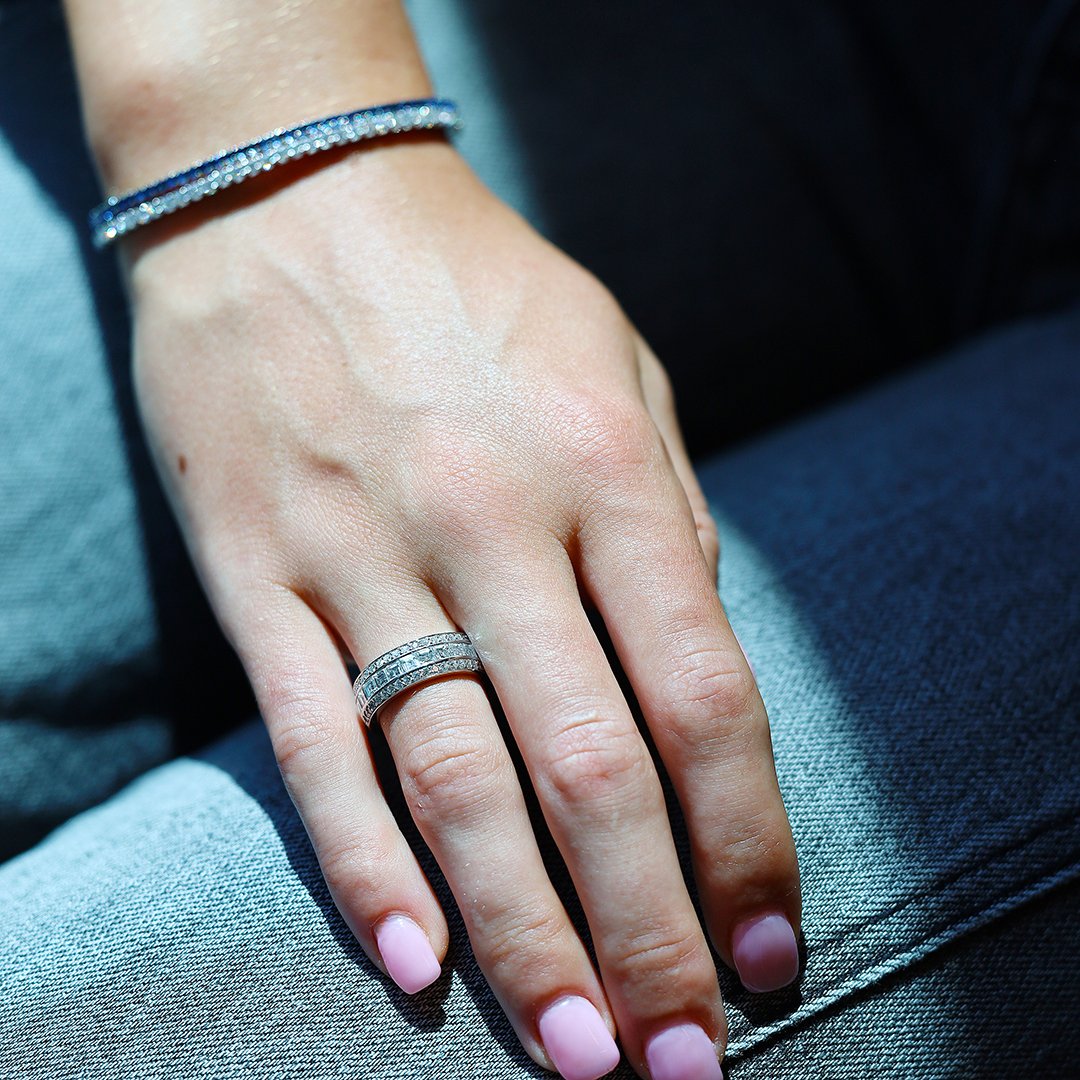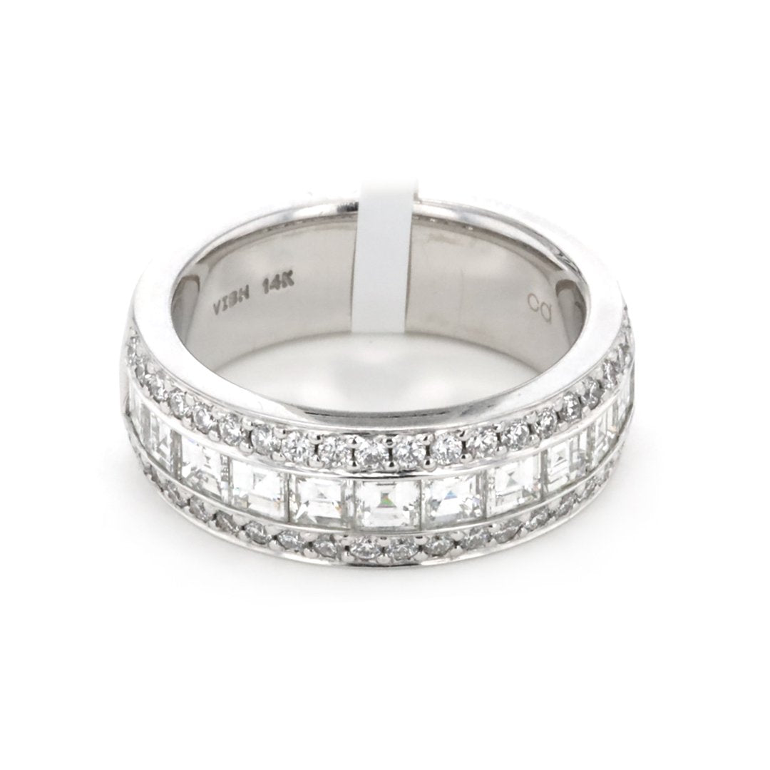 This 14K white gold three-row band features 56 round diamonds totaling 1.90 carats, shared prong set, complemented by channel-set square cut diamonds. All diamonds are FGH color and VS clarity. Part of the Signature Collection by Continental Diamond.