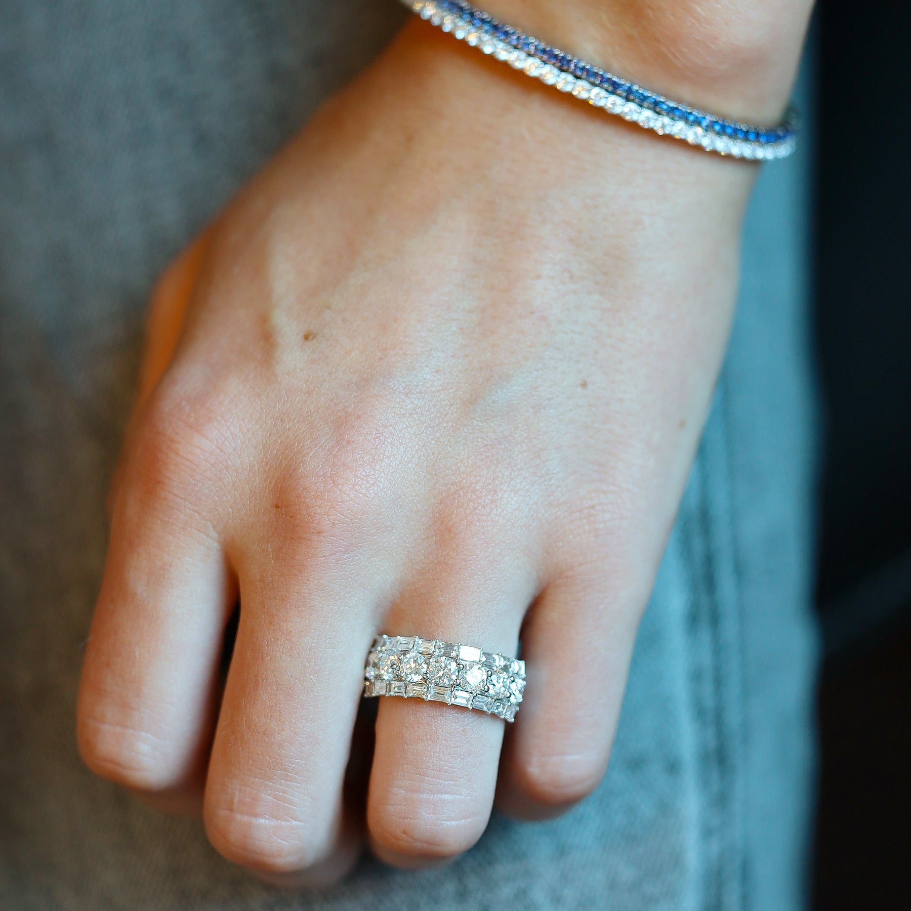 This 18KT white gold 3-row band from the Signature Collection by Continental Diamond showcases 25 baguette diamonds totaling 2.95 carats (FG/VS), paired with a center row of shared prong set round diamonds (GH/VS), creating a refined and dimensional design.