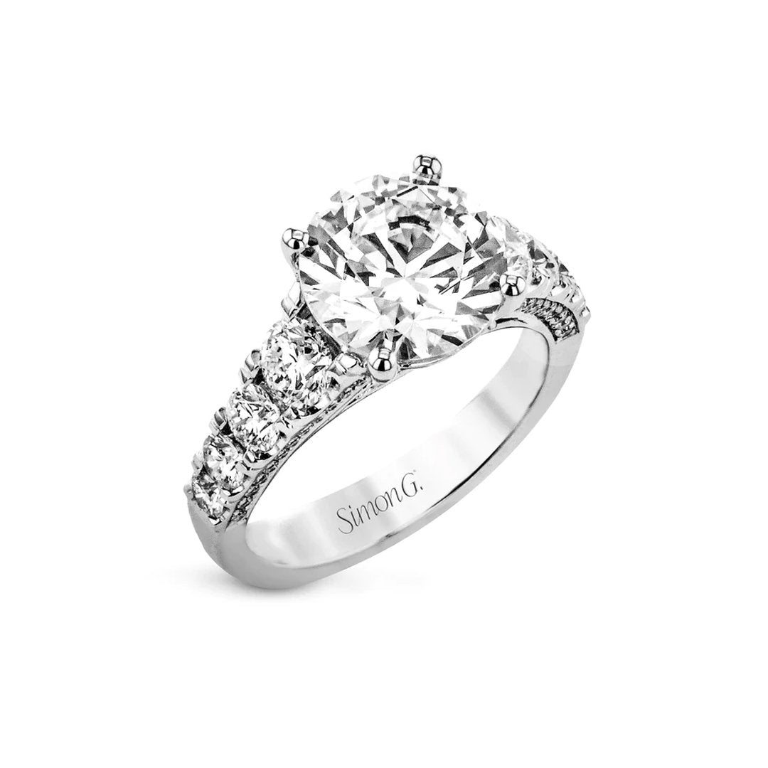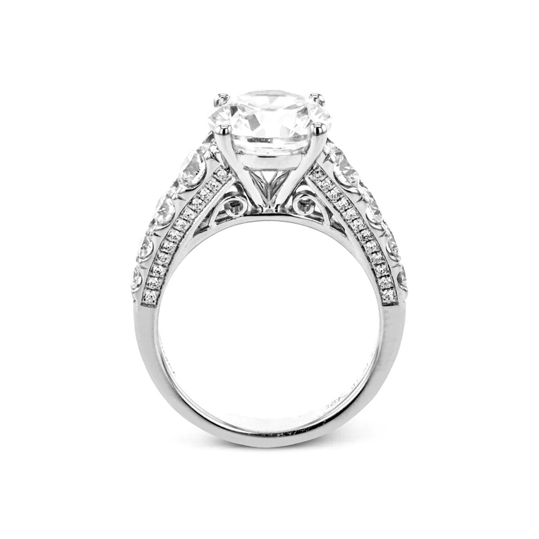 Crafted in 18KT white gold, this cathedral semi-mount ring is designed for a 3.00CT round center. The elegant scroll gallery and diamond-accented shank feature 56 prong-set graduating round diamonds totaling 1.32CTW, graded GH/VS2 for brilliance and clarity. Center sold separately. Available by special order in other metals, shapes, and sizes.